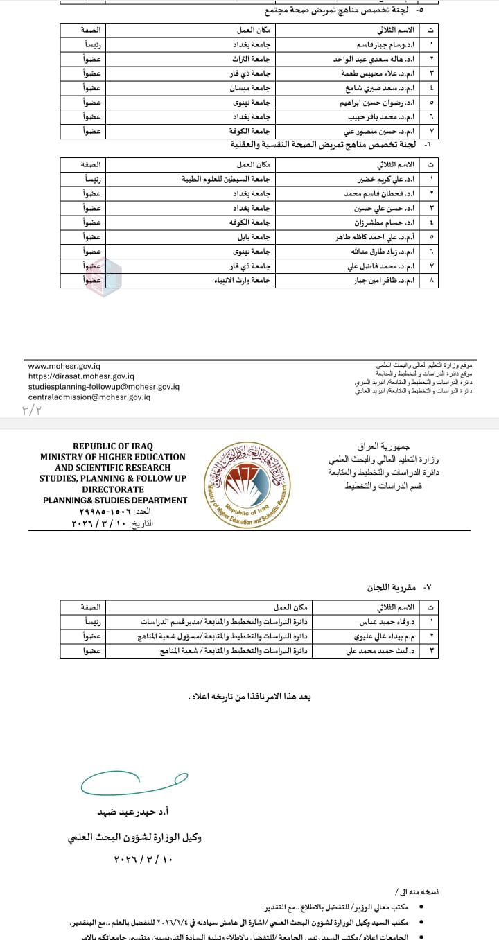 وتتولى اللجنة مهام إعداد وتحديث وتطوير المناهج الدراسية لتخصصات التمريض في الجامعات العراقية، بما ينسجم مع متطلبات التطور العلمي وحاجة سوق العمل، وبما يسهم في تعزيز جودة المخرجات التعليمية.
