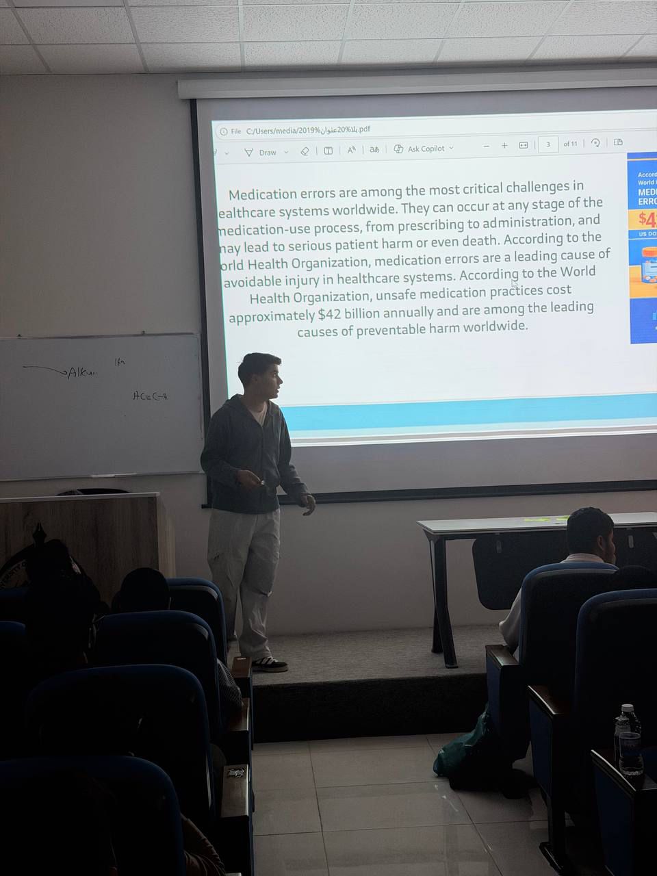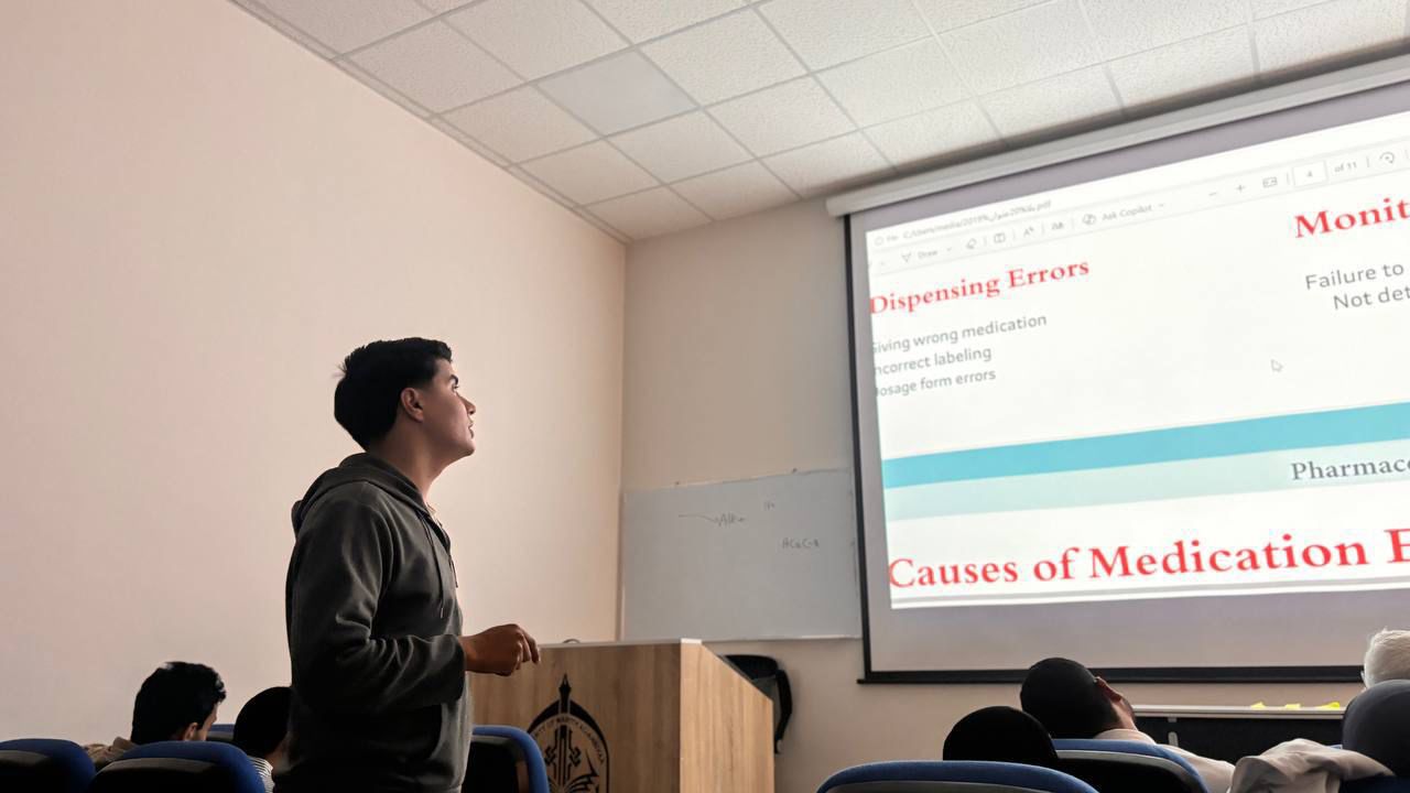 استمراراً للنشاطات العلمية الطلابية وبحضور السيد عميد كلية الصيدلة المحترم، قدّم الطالب [مرتضئ حسن عبد الهادي منسي] عرضاً تقديمياً مميزاً بعنوان ( أنواع الأخطاء الصيدلانية ) .