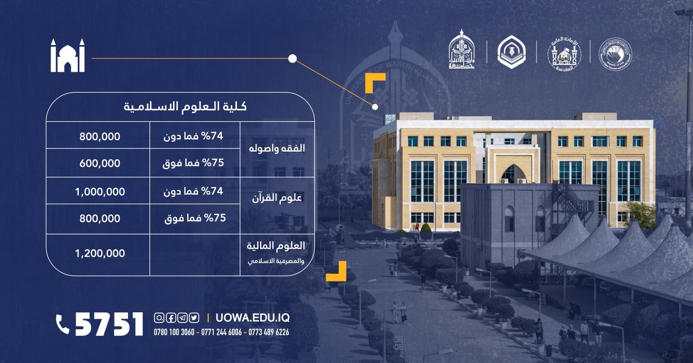 يسر جامعة وارث الانبياء(عليه السلام) أن تعلن للطلبة الاعزاء الراغبين ببدء اولى خطواتهم في طريق النجاح عبر التقديم على كليات واقسام الجامعة ،عن قيمة الاقساط الدراسية للعام الدراسي (2022-2023)