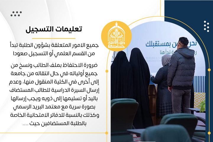 - اطلاع الطلبة على الضوابط والتعليمات والتوجيهات من خلال الاعلان في لوحة الاعلانات وفي أكثر من موقع في الكلية