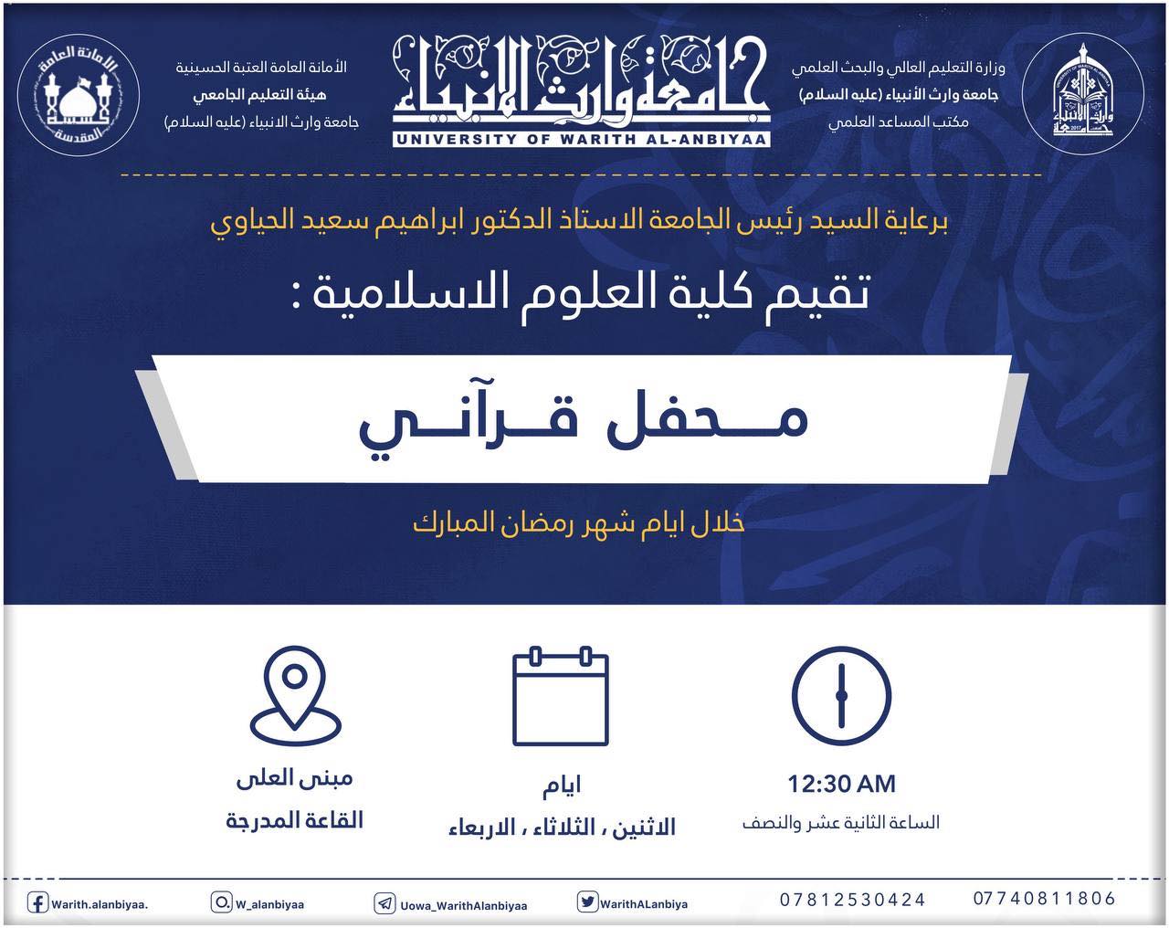 تقيم كلية العلوم الإسلامية في جامعة وارث الانبياء محفلا قرٱنيا وبواقع أربعة أيام من السبت الى الثلاثاء طيلة أيام شهر رمضان المبارك في تمام الساعة 12:30ظهرا على القاعة المدرجة في بناية العلى بحضور القارئ الاستاذ السيد مصطفى الغالبي