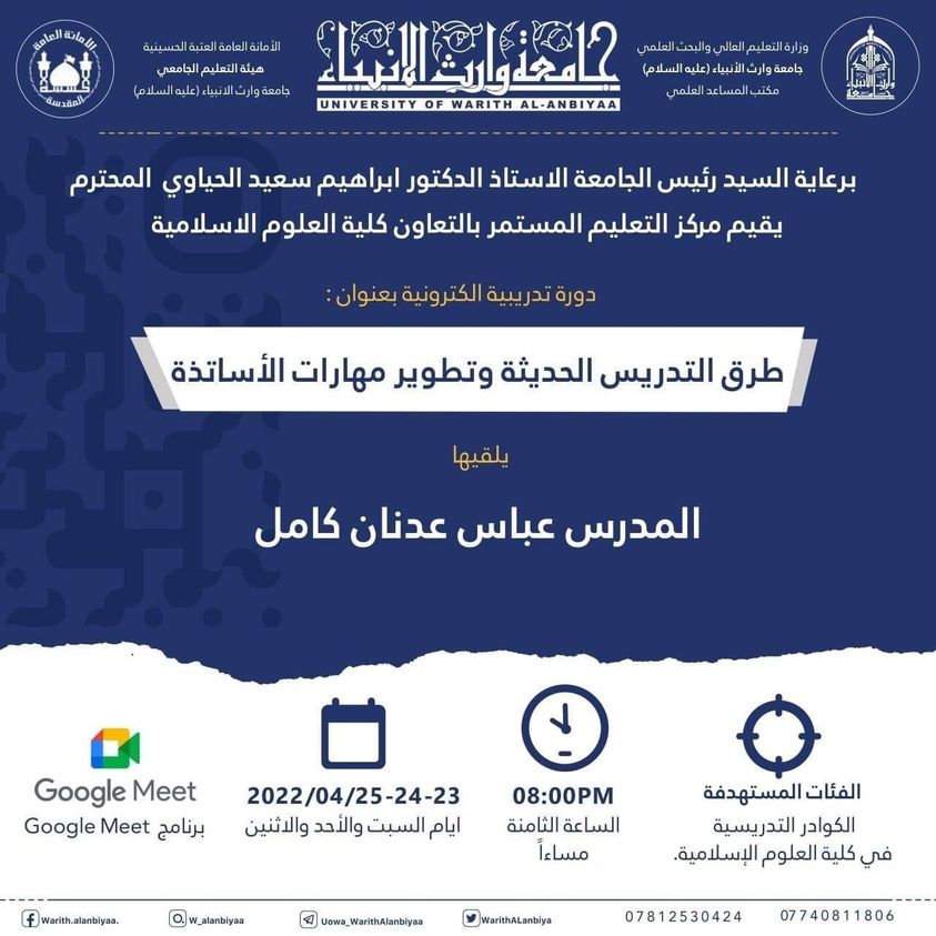 يعلن مركز التعليم المستمر في جامعة وارث الانبياء(عليه السلام) عن اقامة دورة بعنوان (طرق التدريس الحديثة وتطوير مهارات الاساتذة) يحاضر في الدورة المدرس عباس عدنان كامل ، تقام الدورة ايام السبت والاحد والاثنين في تمام الساعة الثامنة مساءا على منصة Google Meet للانظمام للدورة يرجى الدخول على الرابط ادناه: