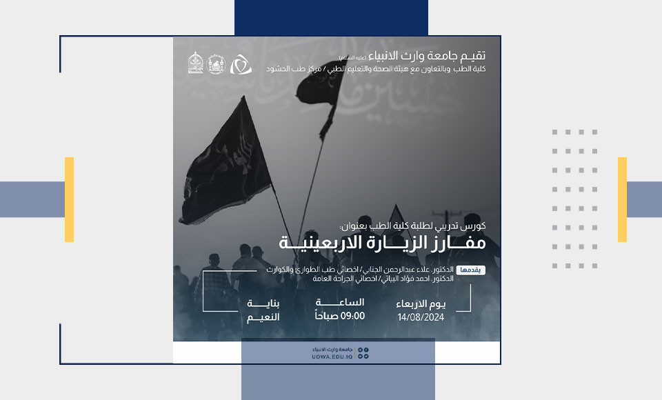 جامعة وراث الأنبياء (عليه السلام) تقيم كورس تدريبي لطلبة كلية الطب بعنوان (مفارز الزيارة الأربعينية) اليوم في بناية النعيم داخل الجامعة.
