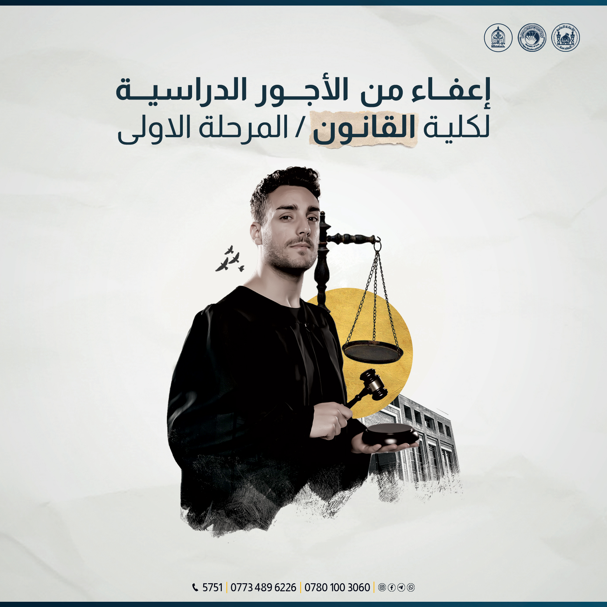 انطلاقا من نهج العتبة الحسينية المقدسة وتوجيهات سماحة المتولي الشرعي الشيخ عبد المهدي الكربلائي دام عزه نحو التماس سبل التعاون البناء وتحقيق اواصر المساهمة الفاعلة بين الجامعة والمجتمع  قررت جامعة وارث الانبياء (عليه السلام)، إعفاء الطلبة المتقدمين إلى كلية القانون المرحلة_الأولى للعام الدراسي الحالي ٢٠٢٣-٢٠٢٤ من القسط الدراسي ليكون حافزاً أمام شبابنا الواعي في اعتلاء سلم العلم و تحقيق حلمهم الدراسي نحو مستقبل واعد...