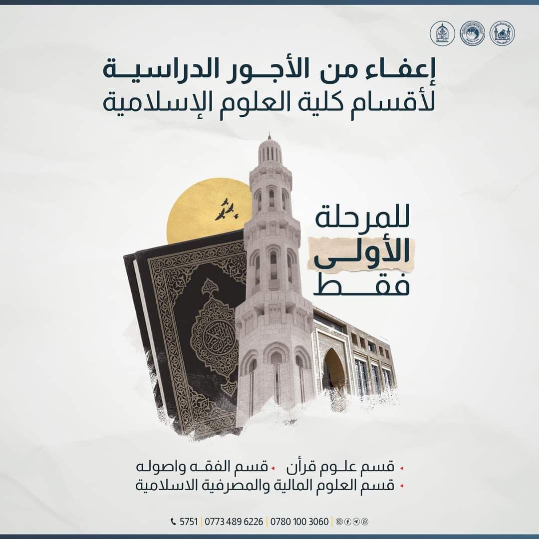 انطلاقاً من نهج العتبة الحسينيّة المقدسة وتوجيهات سماحة المتولي الشرعي الشيخ عبد المهدي الكربلائي (دام عزه)، نحو التماس سبل التعاون البنّاء وتحقيق أواصر المساهمة الفاعلة بين الجامعة والمجتمع، قررت جامعة وارث الأنبياء (عليه السّلام) #إعفاء الطلبة المتقدمين إلى كليّة العلوم الإسلاميّة #المرحلة_الأولى للعام الدراسي الحالي ٢٠٢٣-٢٠٢٤ من القسط الدراسي، ليكون حافزًا أمام شبابنا الواعي في اعتلاء سلّم العلم وتحقيق حلمهم الدراسي نحو مستقبل واعد.