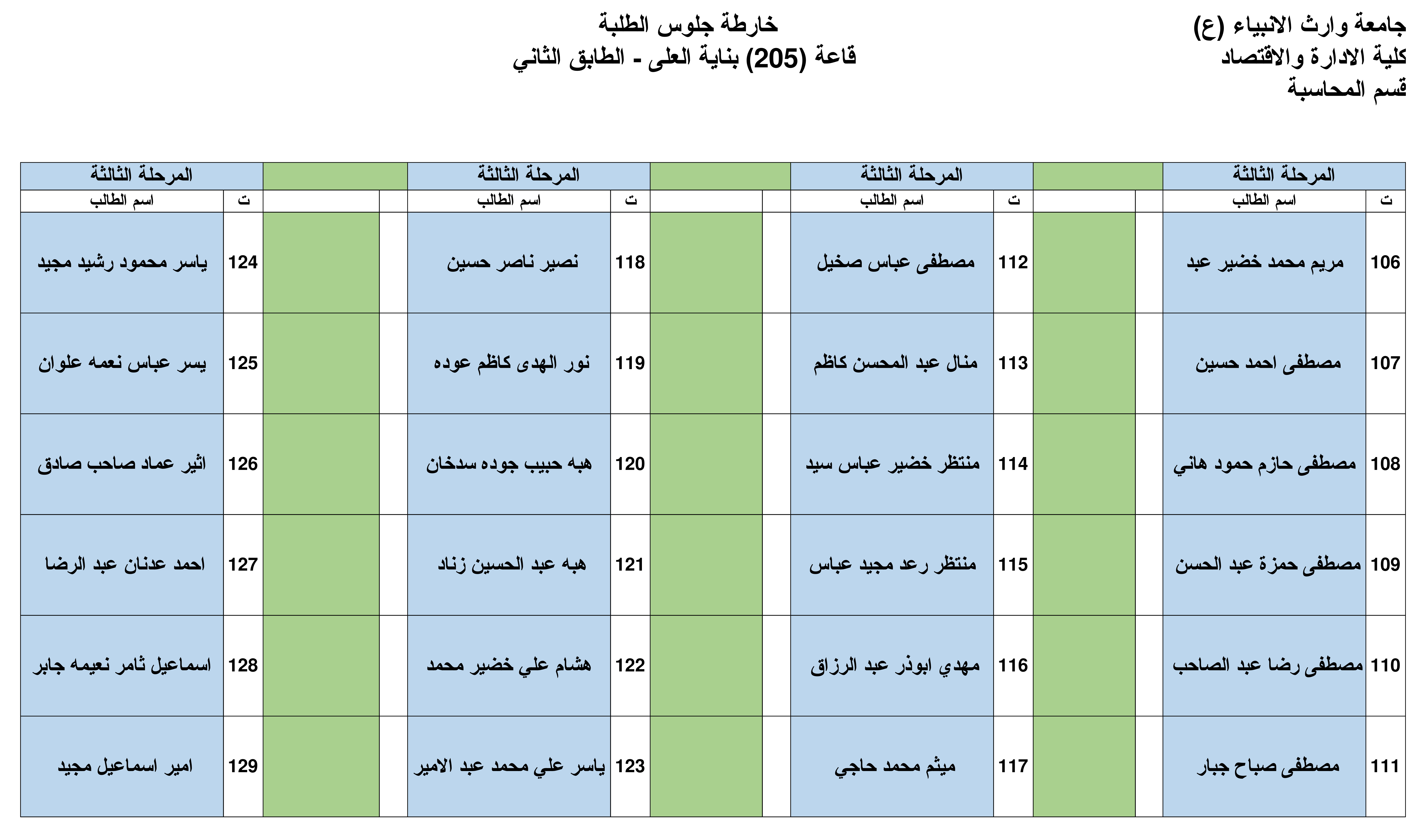 نرفق لكم خارطة الجلوس في القاعات الامتحانية لقسم المحاسبة للمرحلة الأولى والثالثة وكما موضحة في أدناه