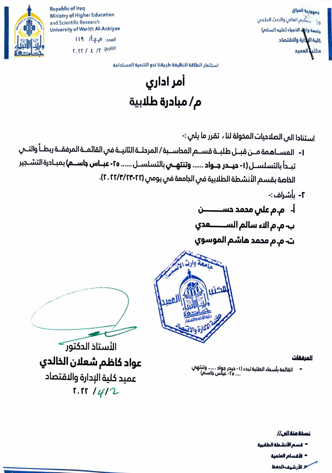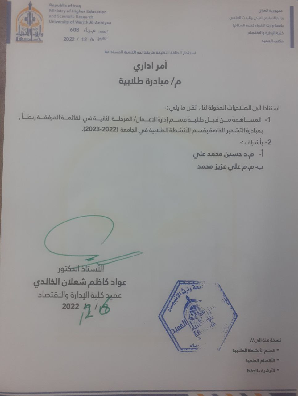 شارك مجموعة من طلبة كلية الادارة والاقتصاد قسم ادارة الاعمال المرحلة الثانية بمبادرة التشجير الخاصة بقسم الانشطة الطلابية في الجامعة