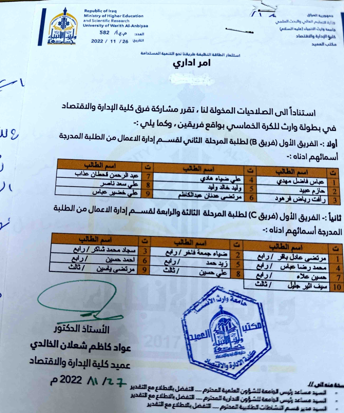 شارك فريقين من كلية الادارة والاقتصاد لقسم ادارة الاعمال المرحلة الثانية والثالثة والرابعة في بطولة وارث للكرة الخماسية