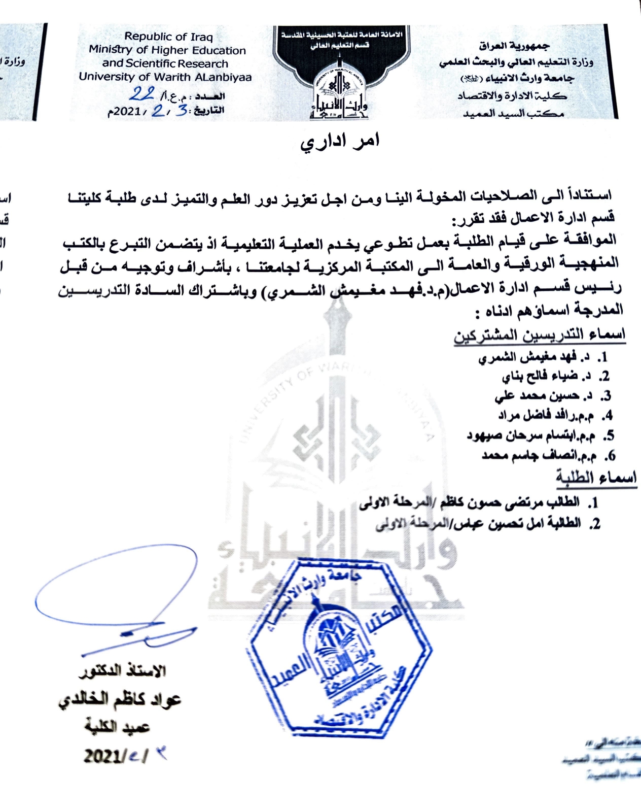قيام طلبة كلية الادارة والاقتصاد بعمل تطوعي يخدم العملية التعليمية اذ يتضمن التبرع بالكتب المنهجية الورقية والعامة الى المكتبة المركزية لجامعتنا