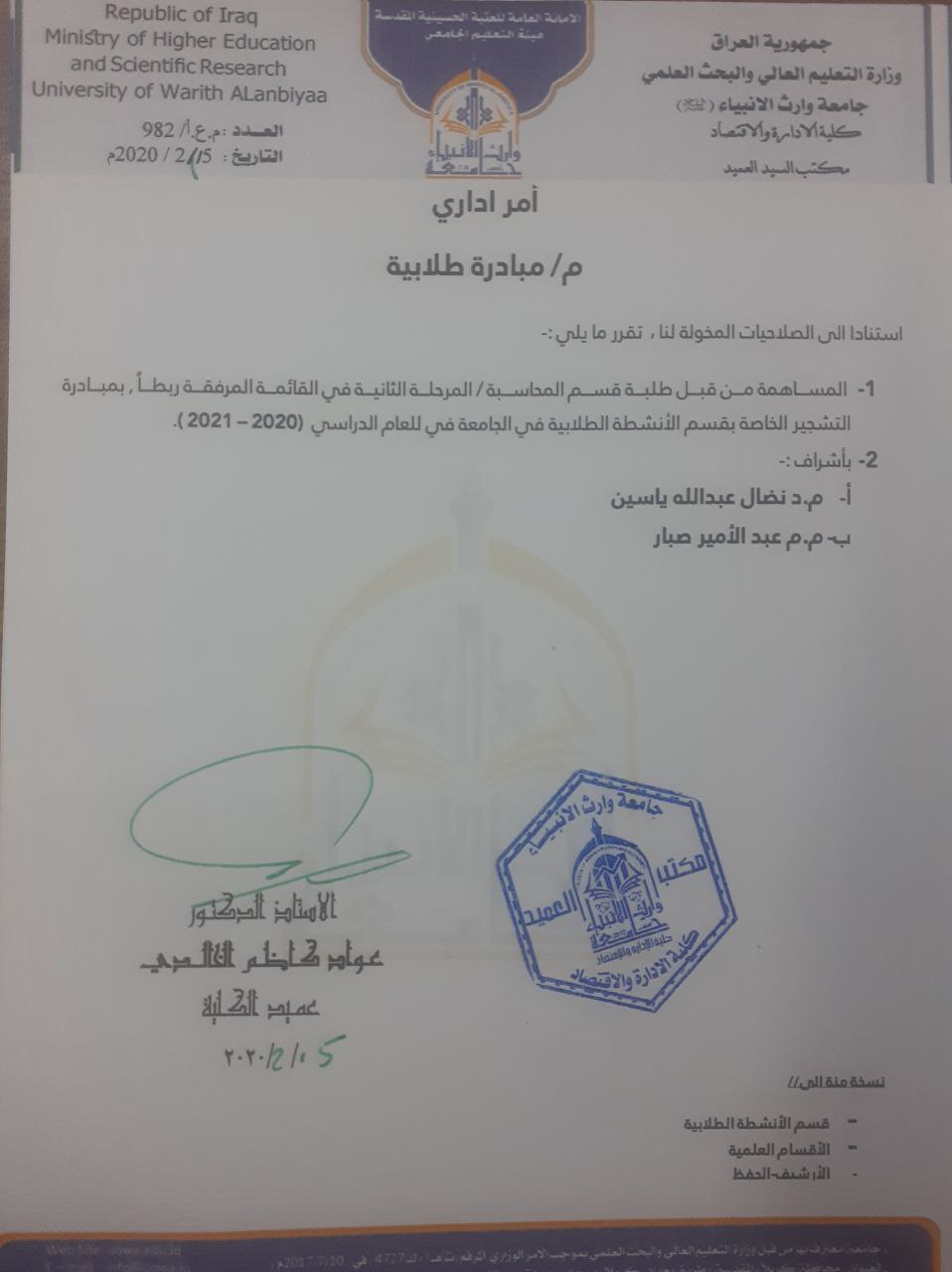 ساهم مجموعة من طلبة كلية الادارة والاقتصاد قسم المحاسبة في جامعة وارث الانبياء في مبادرة التشجير الخاصة بالانشطة الطلابية