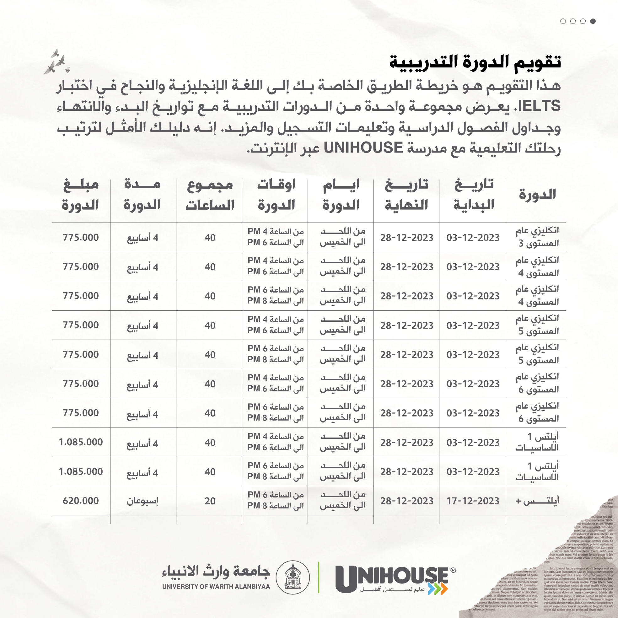 تطلق جامعة وارث الانبياء (عليه السلام)، وبالتعاون مع مؤسسة "يونيهاوس" البريطانية المعتمدة لإدارة الامتحان و البرامج التحضيرية: برنامجها الخاص بالدورات التدريبية للطلاب الراغبين بالحصول على "شهادة ال IELTS البريطاني".