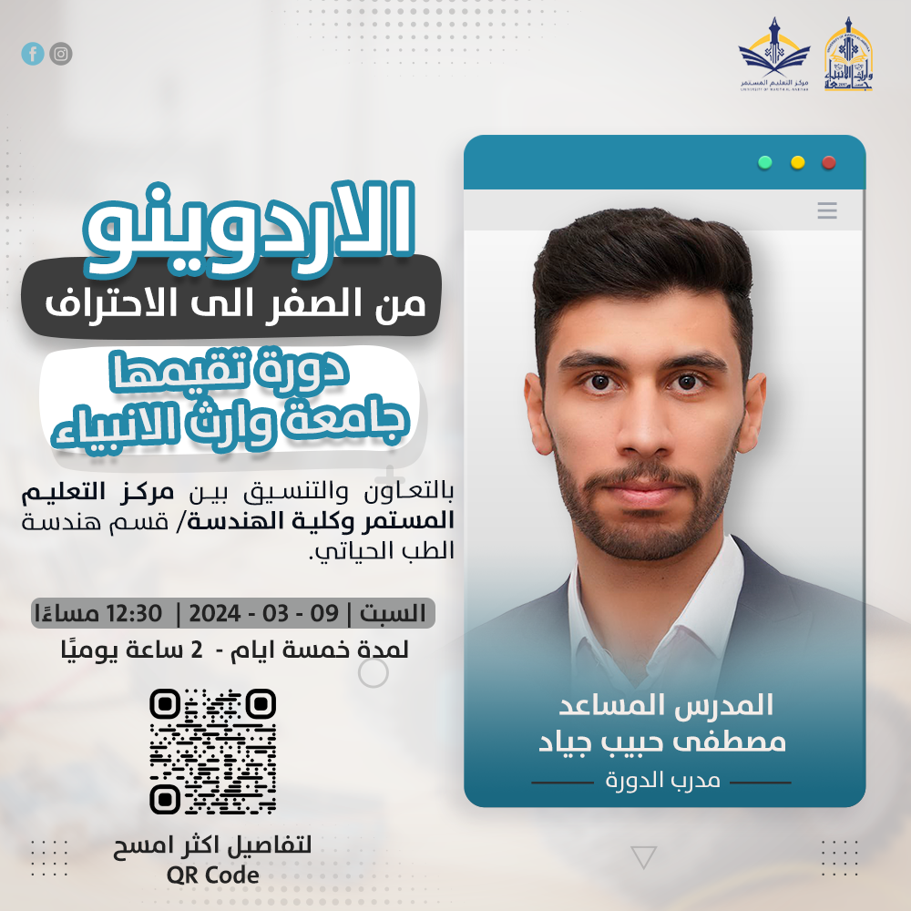 في سياق ما تقدم أعلاه يقيم مركز التعليم المستمر وبالتعاون والتنسيق مع كلية الهندسة / قسم هندسة الطب الحياتي دورة (الاردوينو من الصفر الى الاحتراف (وحسب التفاصيل التالية: