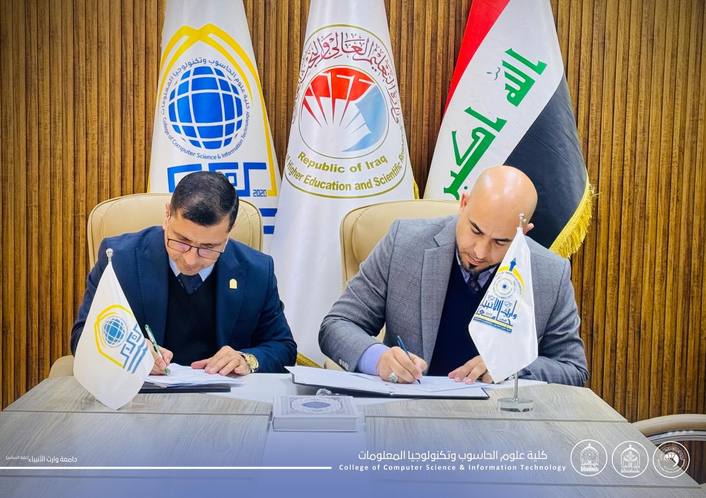 وقّع الأستاذ المساعد الدكتور حيدر محمد علي الغانمي، عميد كلية علوم الحاسوب وتكنولوجيا المعلومات بجامعة وارث الانبياء عليه السلام، اتفاقية توأمة علمية مع الأستاذ المساعد الدكتور موفق كاظم الحسناوي، عميد كلية علوم الحاسوب وتكنولوجيا المعلومات في جامعة كربلاء.