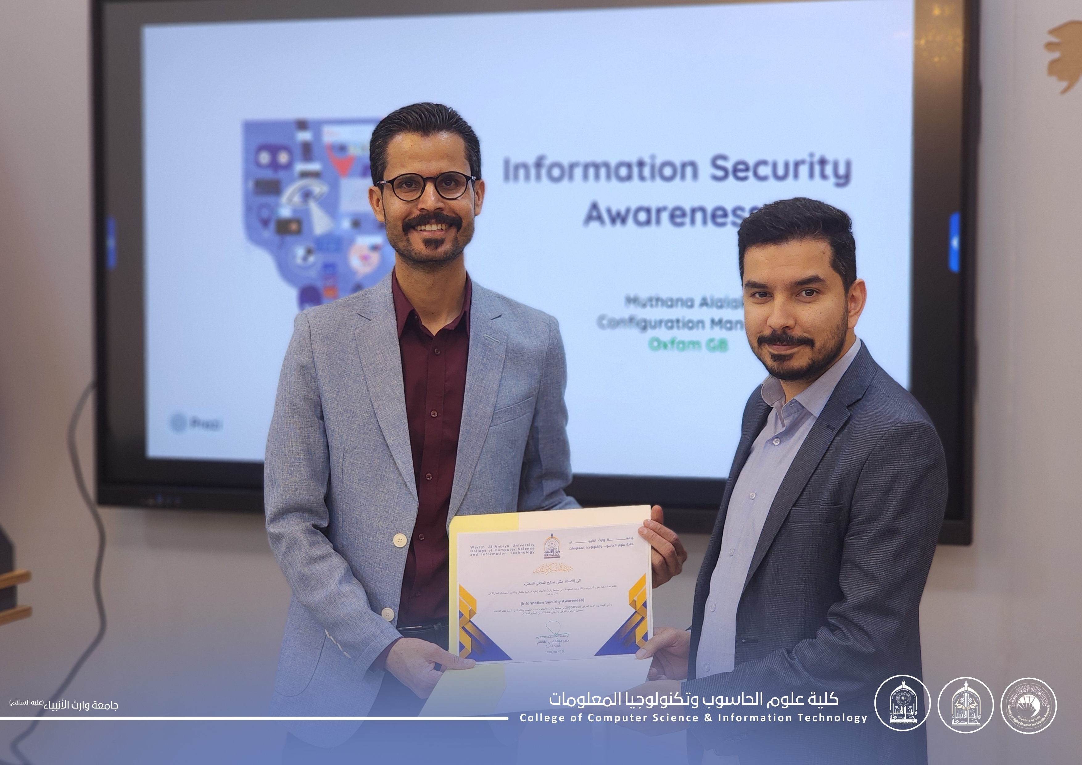 قدّم الورشة م.م مثنى صالح مهدي العلاگي، حيث تناول أبرز مفاهيم الأمن السيبراني، وطرق الوقاية من التهديدات الإلكترونية، إضافة إلى أهمية تبنّي الممارسات الصحيحة لحماية المعلومات الشخصية والمؤسسية.