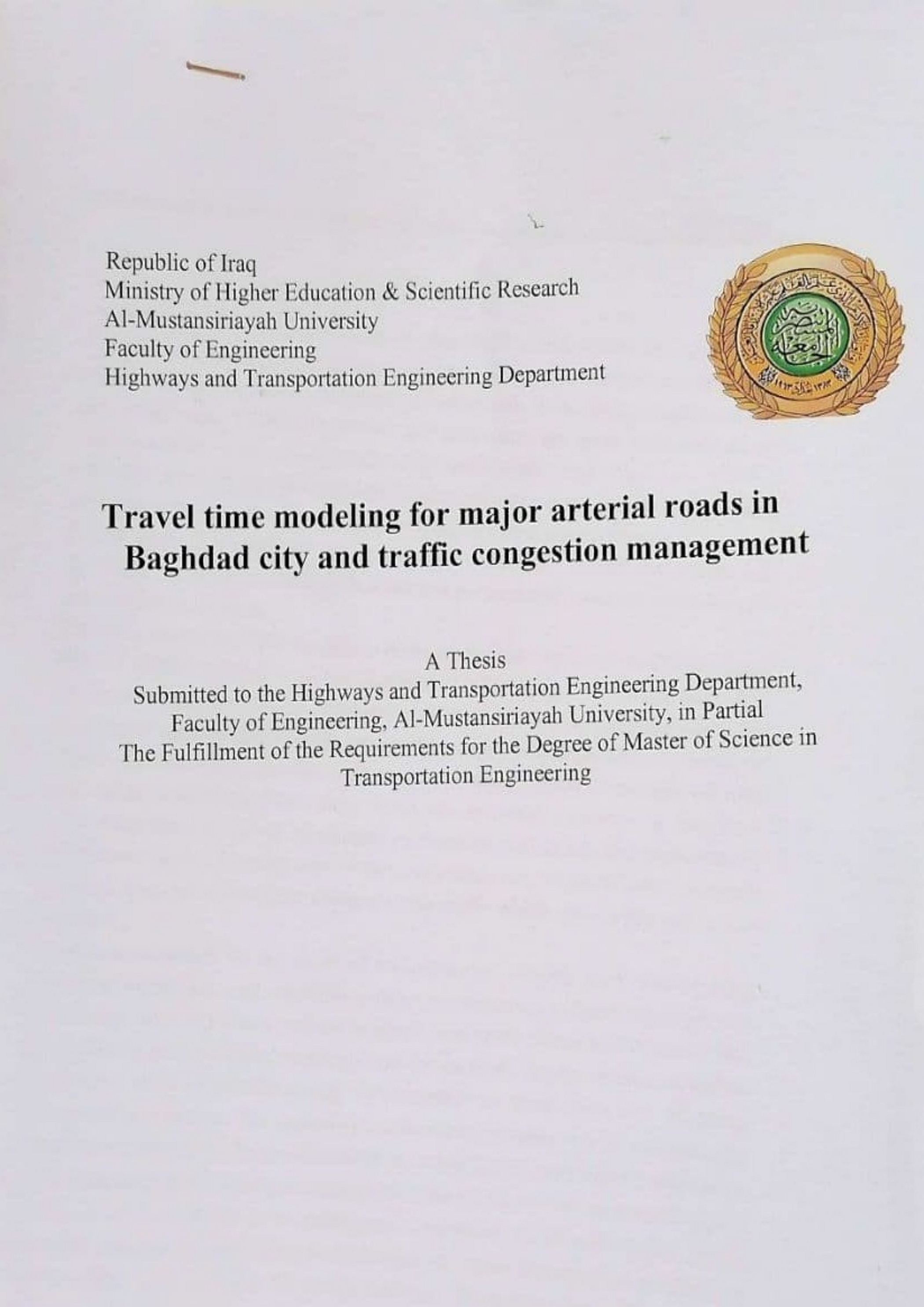 قيم الباحث الأستاذ المساعد الدكتور انمار فالح ديكان التدريسي في كلية الهندسة - قسم الهندسة المدنية رسالة ماجستير بعنوان Travel time modeling for major arterial roads in Baghdad city and traffic congestion management مقدمة إلى الجامعة المستنصرية - كلية الهندسة - قسم هندسة الطرق و النقل.