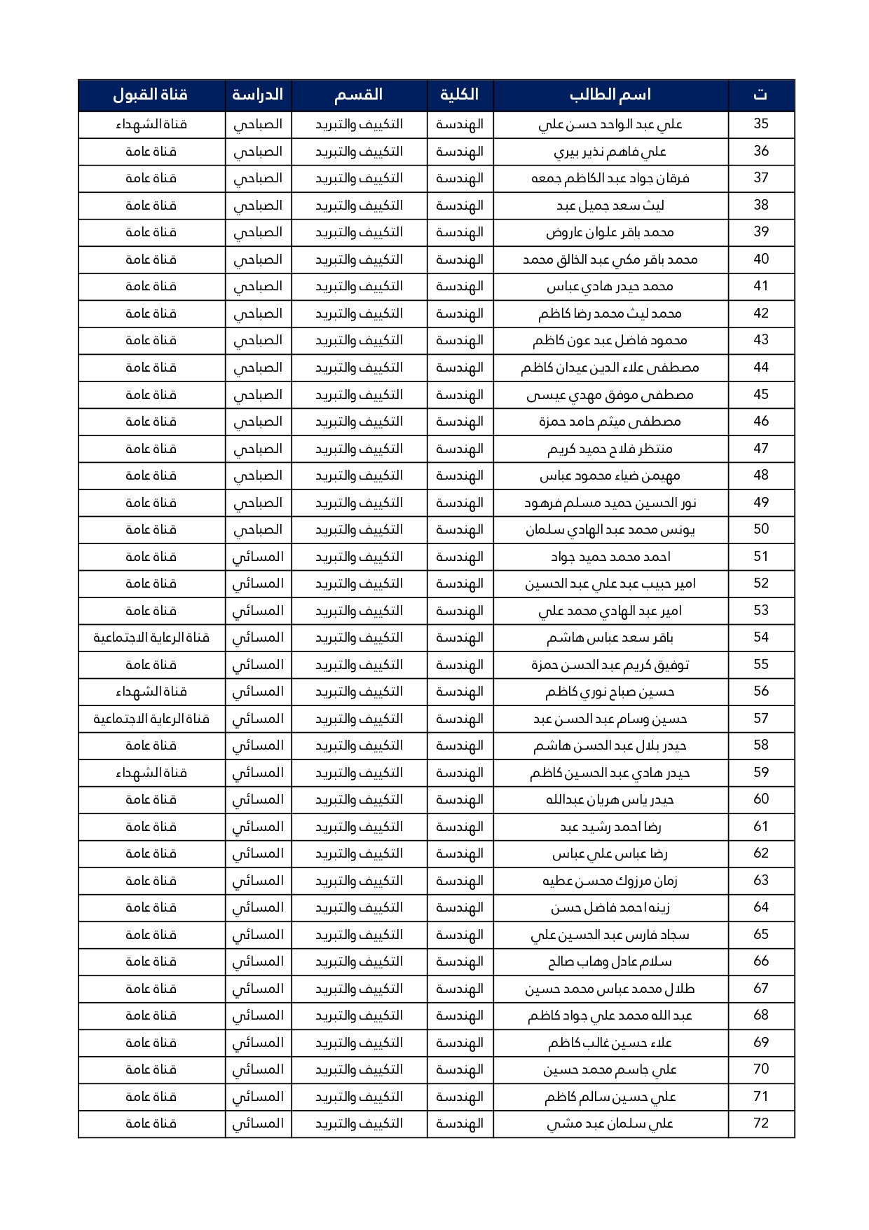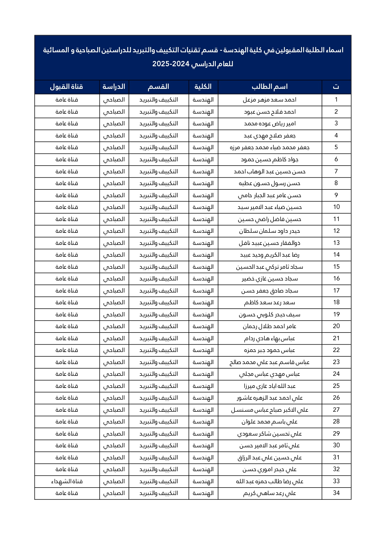 اسماء الطلبة المقبولين في قسم هندسة تقنيات التبريد و التكييف للعام الدراسي 2025/2024 للدراستين الصباحية و المسائية