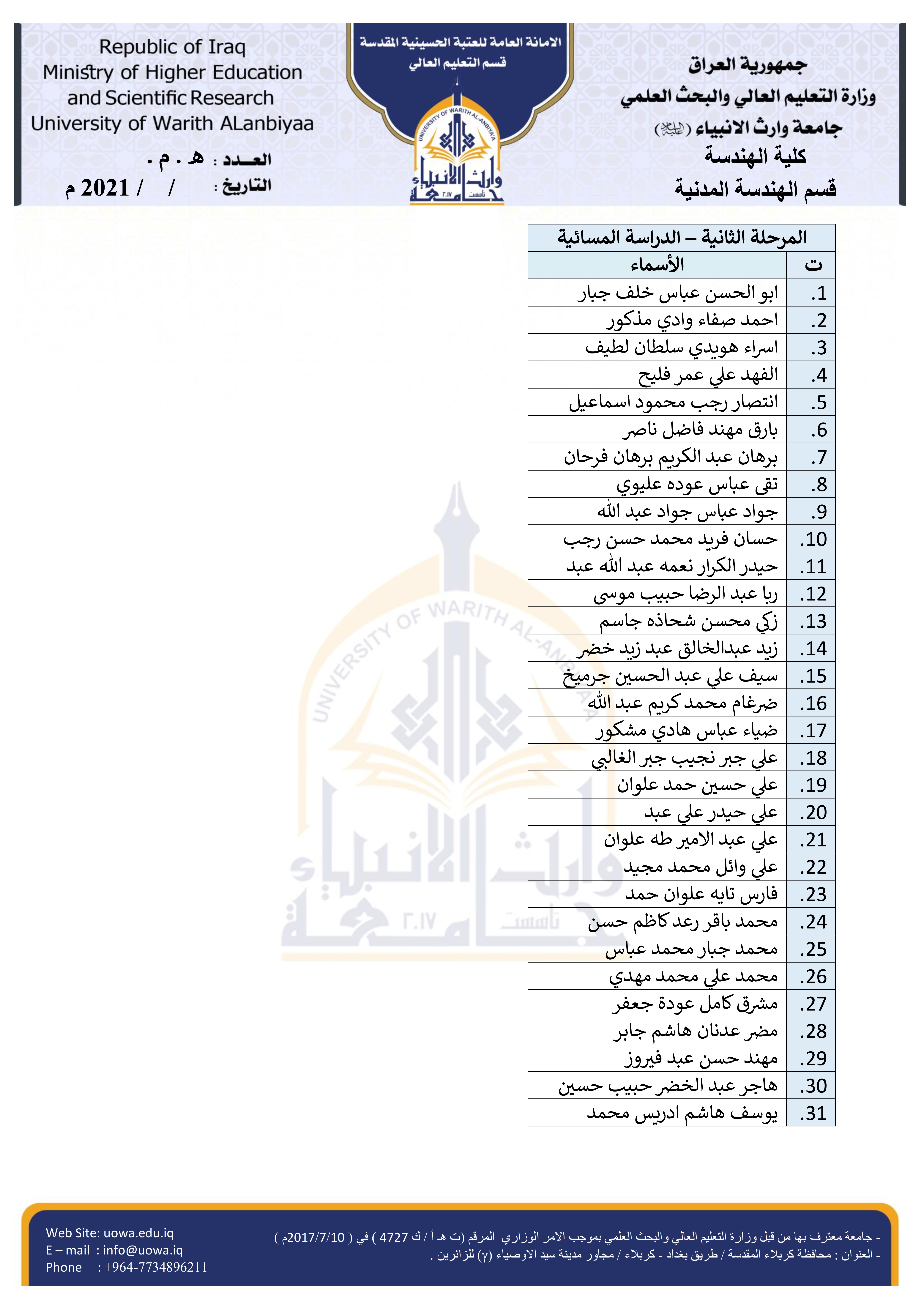 أدناه قوائم الأسماء الخاصة بالطلبة المشمولين بالامتحانات الحضورية لقسم الهندسة المدنية.