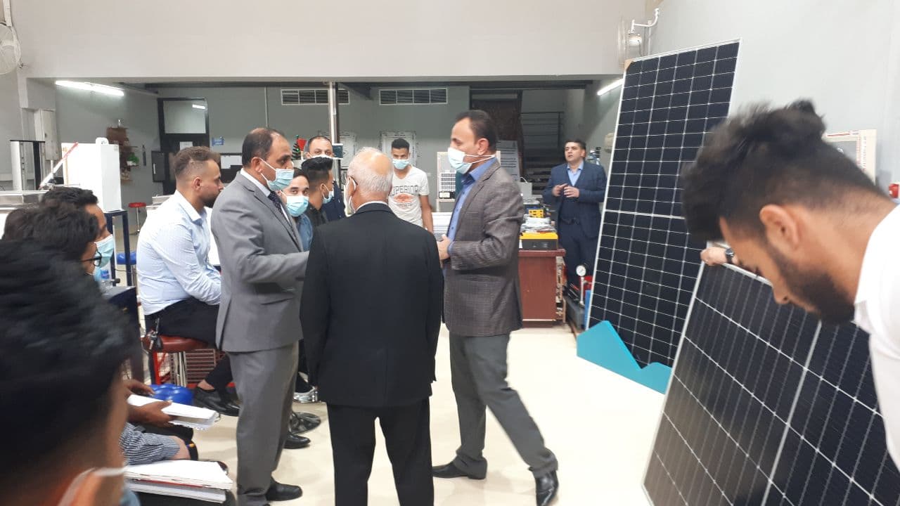 برعاية السيد المساعد العلمي لجامعة وارث الأنبياء وبأشراف مباشر من السيد عميد كُلْيَة الهندسة المحترم والسيد رئيس قسم هندسة تقنيات التكييف والتبريد أقيمت ورشة عملية في نصب منظومات شمسية وعلى مدى ثلاث أيام من قبل أساتذة قسم التكييف والتبريد وكادر شركة متخصص في هذا المجال وتستهدف هذه الورشة طلبة المرحلة الرابعة حيث يشمل البرنامَج التدريبي في اليوم الأول على التعرف على أنواع الخلايا الشمسية ومكونات المنظومات الشمسية وكيفية ربطها على التوالي والتوازي وقياس زاويه الأسقاط الشمسي وقياس كفائتها عند زوايا معينه وتأثير نسبه الظل على مقدار الفولتيه المتحققة وفي اليوم الثاني سيتدرب الطلبة على كيفية أجراء الصيانة على جهاز الانفيرتر والتعرف على طريقة عملة وكيفية استبدال القطع والعناصر التالفه فيه بوضع اخرى مشابه او مكافئة يتم استخراجها وفق جداول علمية أما اليوم الثالث سيتم تدريب الطلبة على كيفية اختيار النوع الملائم من المنظومات الشمسية لمشروع معين وكيفية تحديد معايير اختيار المنظومة المناسبة. ولله ولي التوفيق…