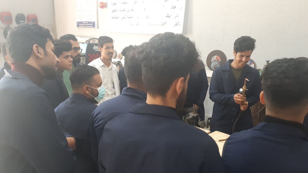 جانب من المحاضرات العملية لورشة اللحام لطلبة قسم هندسة تقنيات التكييف والتبريد حيث تدرب الطلبة على اجراء اللحام الغازي بأستخدام غازي الاوكسي استلين والمستخدم في التطبيقات الصناعية لمجال التكييف والتبريد