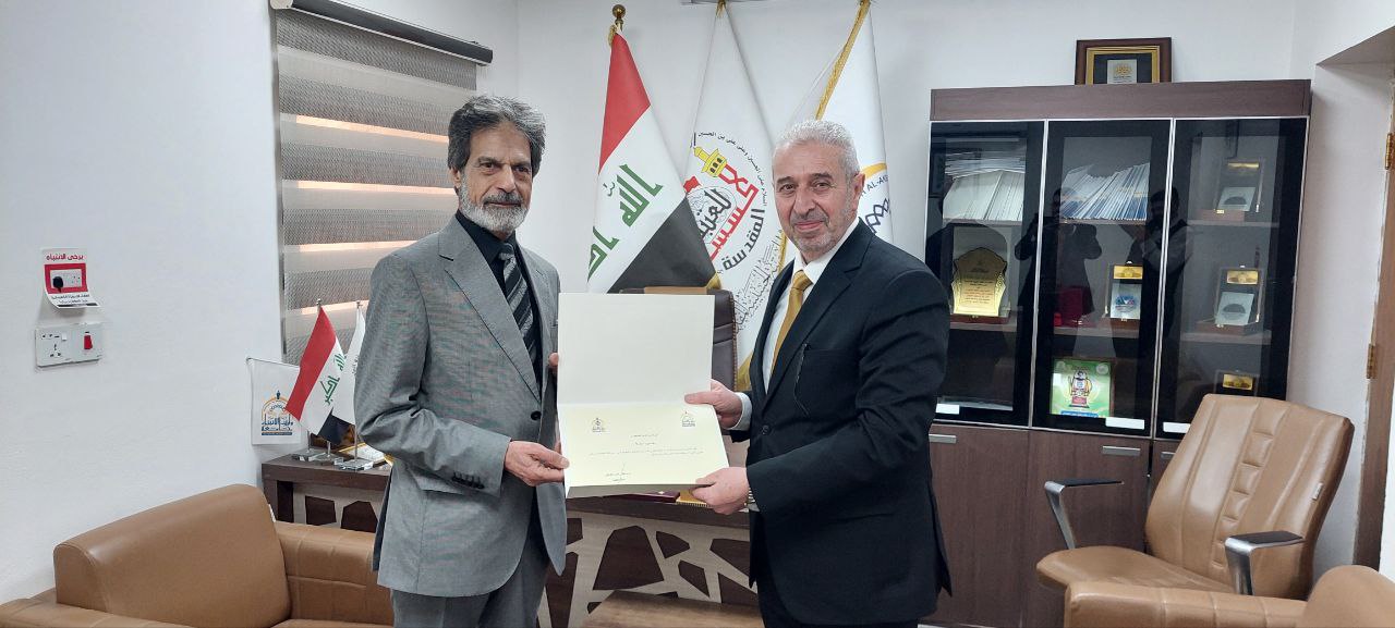 تسلّم وفد من كلية العلوم الإسلامية برئاسة السيد عميد الكلية الدكتور طلال فائق الكمالي المصحفَ الشريف المخطوط بأقلام طلبة وأساتذة ومنسوبي جامعة وارث الأنبياء (عليه السلام)، وذلك بعد إتمام أعمال تجليده في مركز مخطوطات العتبة الحسينية المقدسة، متمثلاً بـ السيد الدكتور مناف التميمي مدير المركز.