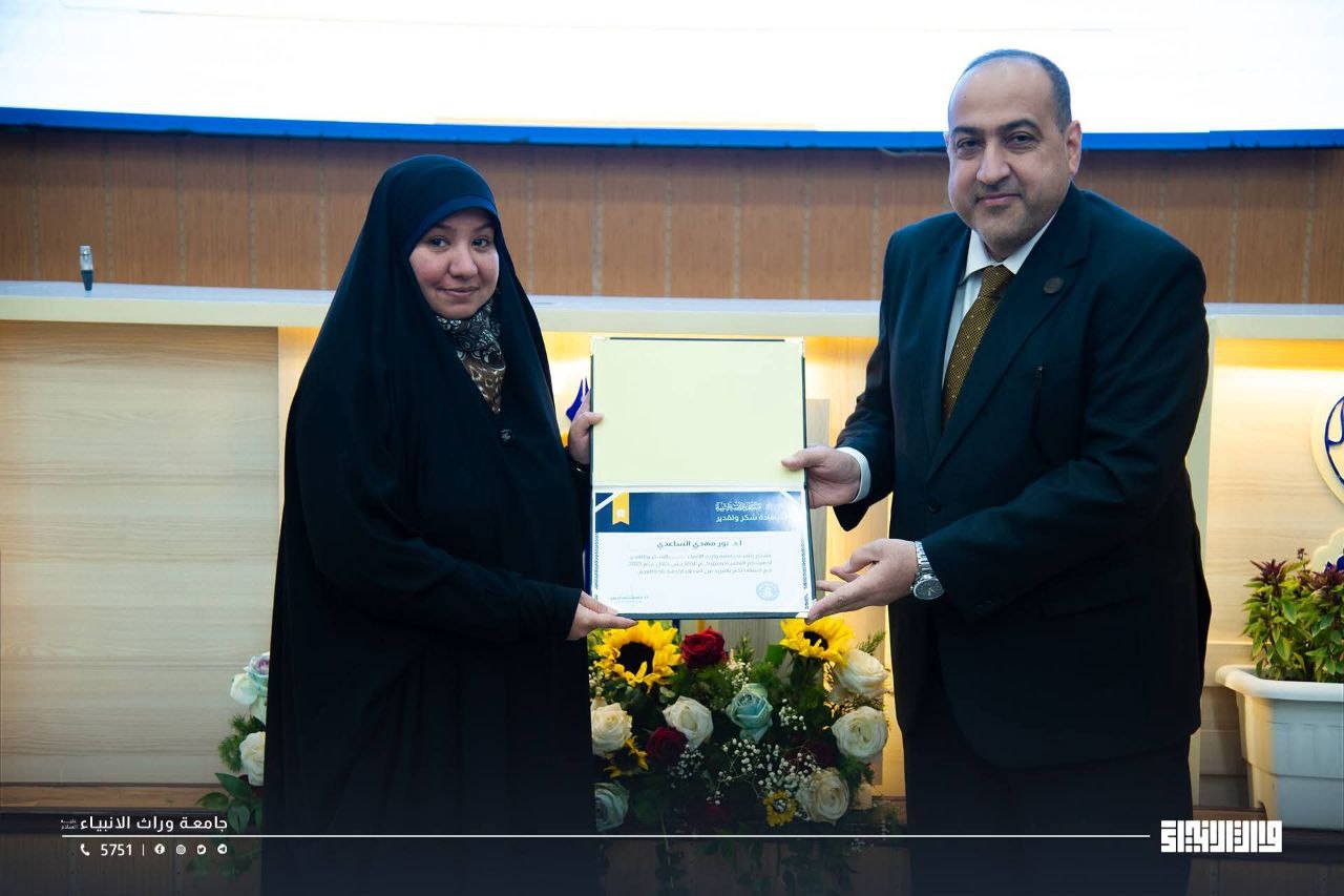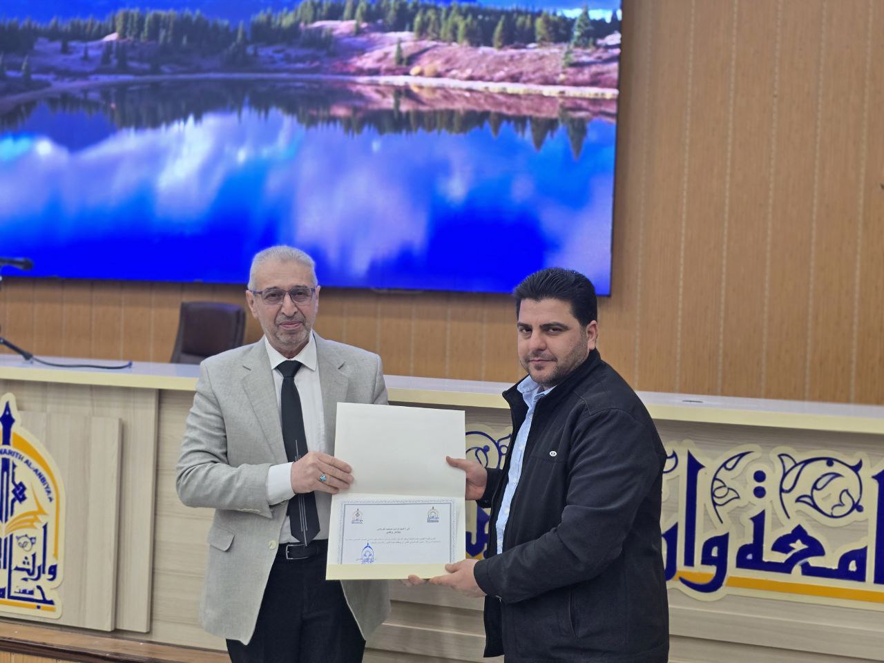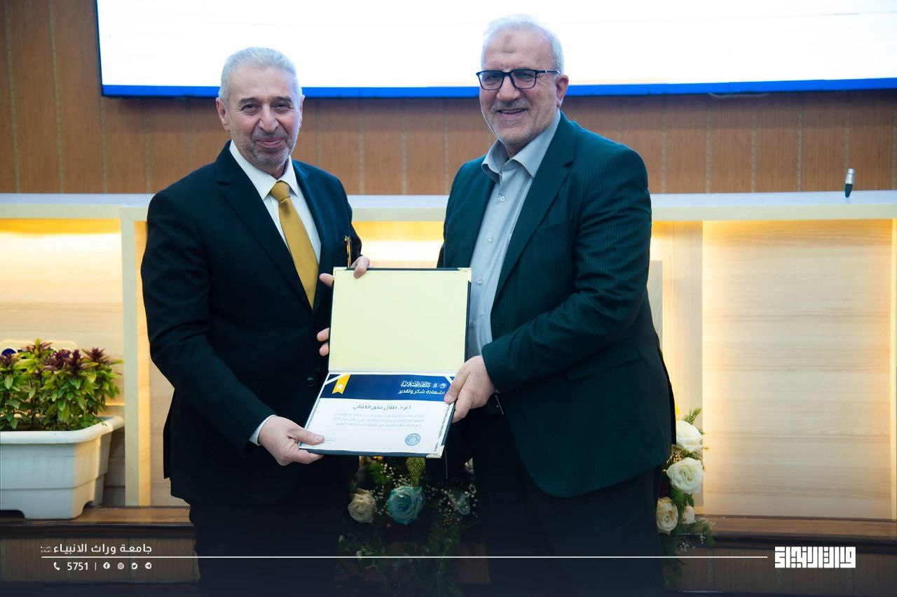 بحضور الأمين العام للعتبة الحسينية المقدسة رئاسة جامعة وارث الأنبياء (عليه السلام) تتقدّم بالشكر والتقدير لعميد كلية العلوم الإسلامية. بحضور الأمين العام للعتبة الحسينية المقدسة، تتقدّم رئاسة جامعة وارث الأنبياء (عليه السلام) بخالص الشكر وعظيم التقدير إلى عميد كلية العلوم الإسلامية الأستاذ المساعد الدكتور طلال فائق الكمالي ؛ تثمينًا لجهوده العلمية والأكاديمية المتميزة التي قدّمها خلال عام 2025، وما أسهم به من عطاءٍ فاعل في تطوير الأداء الأكاديمي والارتقاء بالمستوى العلمي للكلية.وأشادت رئاسة الجامعة بالدور القيادي الذي اضطلع به الدكتور الكمالي في تعزيز مسارات التعليم والبحث العلمي، ودعمه المتواصل للكوادر التدريسية والطلبة، بما ينسجم مع رؤية الجامعة ورسالتها المستمدة من القيم الإسلامية الأصيلة.