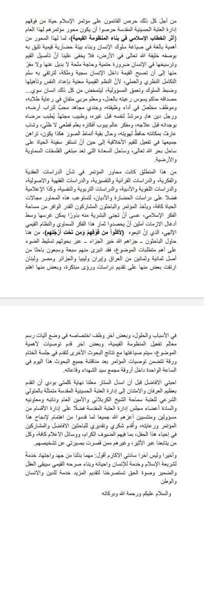 برعاية كريمة من لدن الامانة العامة للعتبة الحسينية المقدسة أنهت كلية العلوم الإسلامية في جامعة وارث الأنبياء مؤتمرها الدولي السنوي الثالث الاسلام حياة والذي إقامته بالتعاون مع كلية العلوم الإسلامية في جامعة كربلاء المقدسة والذي حمل شعار اثر الخطاب الإسلامي في بناء المنظومة القيمية الإسلامية بمشاركات محلية ودولية وعالمية وبواقع أكثر من سبعين بحثا علميا رصينا من العراق وإيران والجزائر وتونس ومصر ولبنان وقد حضر المؤتمر شخصيات علمية على المستويين الحوزوي والأكاديمي وقدم السيد رئيس هيئة التعليم العالي في العتبة الحسينية المقدسة كلمة الأمانة بخصوص المؤتمر وهدفها من رعاية هكذا مؤتمرات علمية تصب في الصالح العام والدين الإسلامي بالإضافة إلى الجلسات البحثية التي تقدم بها كل من الشيخ حسين ال ياسين والذي أكد من خلالها على ضرورة الحفاظ على الثوابت القيمية والأخلاقية التي تعد أساسا لا يمكن التنازل عنه وفق المنظومة التشريعية الإسلامية والاستاذ الدكتور حمزة مرتضى من جمهورية لبنان العزيزة إذ أشار إلى ضرورة ارتباط العبادة بالعمل فلا خير في عبادة لا تؤثر في سلوكيات الإنسان الاجتماعية والتربوية مع الآخر والاستاذ المساعد الدكتور طلال الكمالي عميد كلية العلوم الإسلامية في جامعة وارث الأنبياء إذ أشار في كلمته إلى مرتكزات الخطاب الإسلامي ومميزاته وهدفه في تحقيق التلاقح الفكري والإنساني ودائما ما يسعى إلى استقطاب الآخر في خطاب اسلامي معتدل نابع من الاصالة والإنسانيةثم توجه المؤتمرون إلى مجمع سيد الشهداء لافتتاح الجلسات البحثية والتي شهدت إقامة ما يقارب ثمان جلسات موزعة بحسب الاختصاصات العلمية المندرجة ضمن محاور المؤتمر واعقبتها الجلسة الختامية التي كُرم فيها السادة الباحثين وممن حصل على المرتبة الأولى في تقييم البحوث العلمية إذ قُدمت لهم جوائز لاول خمس بحوث حصلت على أعلى درجة في التقييم