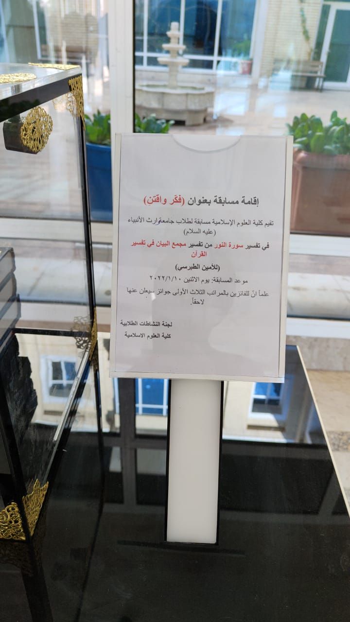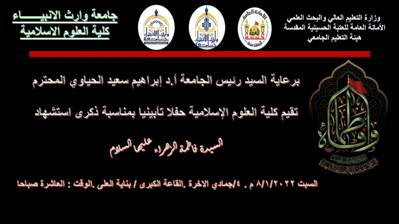 برعاية السيد رئيس الجامعة المحترم تقيم كلية العلوم الإسلامية مسابقة لحفظ والقاء مقطع من خطبة السيدة الزهراء عليها السلام وذلك في يوم السبت الموافق 8/1/2022
