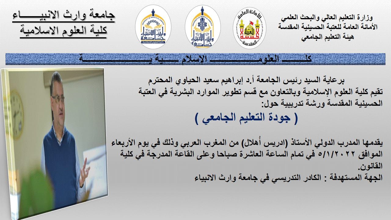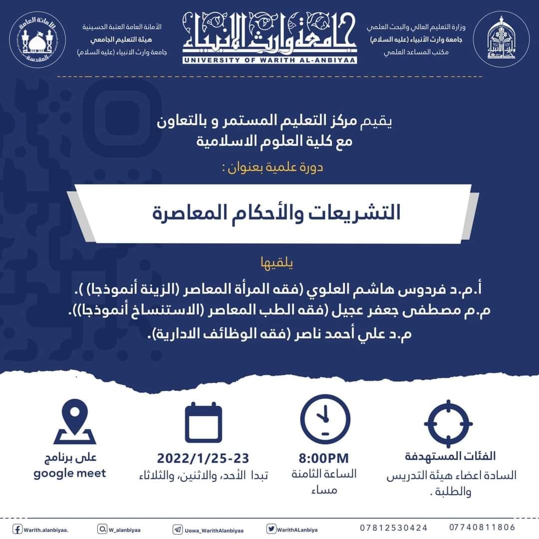 يقيم مركز التعليم المستمر في جامعة وارث الانبياء وبالتعاون مع كلية العلوم الإسلامية دورة علمية بعنوان ( التشريعات والأحكام المعاصرة) والتي تعقد ابتداء من يوم الأحد الموافق ٢٣ / ١ / ٢٠٢٢ ولمدة ثلاث ايام تلقى الدورة إلكترونيا على منصة الكوكل ميت في تمام الساعة الثامنة مساء يلقيها كل من ( أ. م. د فردوس هاشم احمد، م. د علي احمد ناصر، م. د مصطفى جعفر عجيل علما ان الفئة المستهدفة هم اساتيذ الجامعة وطلبتها