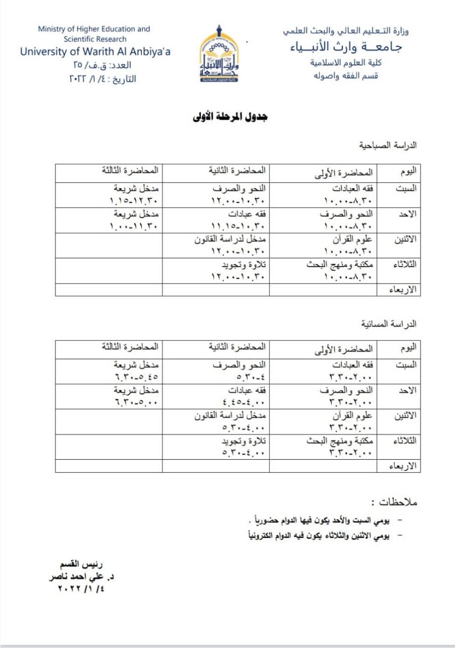 جدول الدروس الاسبوعي لقسم الفقه واصوله / المرحلة الأولى