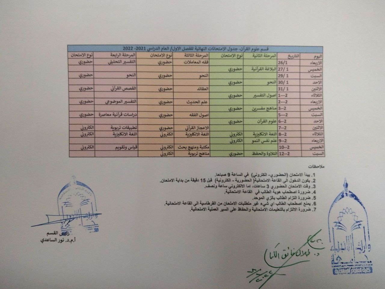 جدول امتحانات نهائي الفصل الأول لقسم علوم القرآن