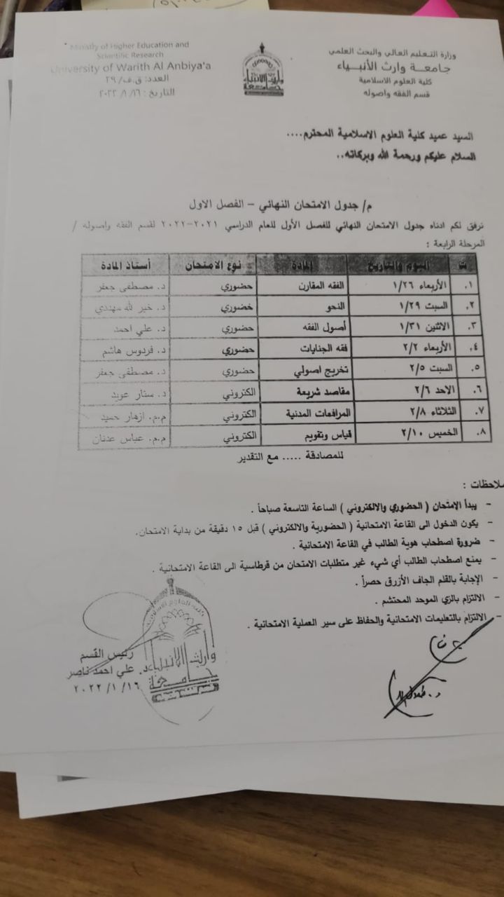 باشرت كلية العلوم الإسلامية في جامعة وارث الأنبياء اليوم الاربعاء الموافق 26/1/2022 الامتحانات النهائية للفصل الدراسي الاول للعام الدراسي 2021 -2022 .