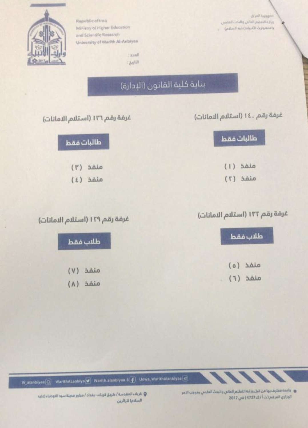 8.سيكون أداء الامتحانات في بناية العلى وعلى القاعات الدراسية والتي تبدأ من القاعة رقم 101_106 ملاحظة/ الامتحان يبدأ الساعة 9 صباحادعاؤنا لكم بالنجاح والسداد