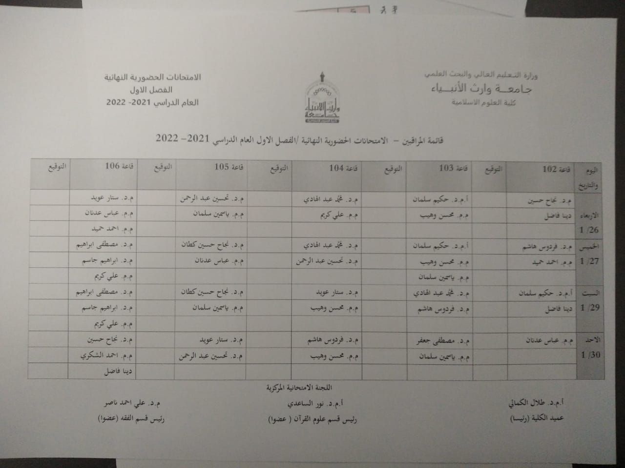قائمة المراقبين للامتحانات الحضورية لنهائي الفصل الاول