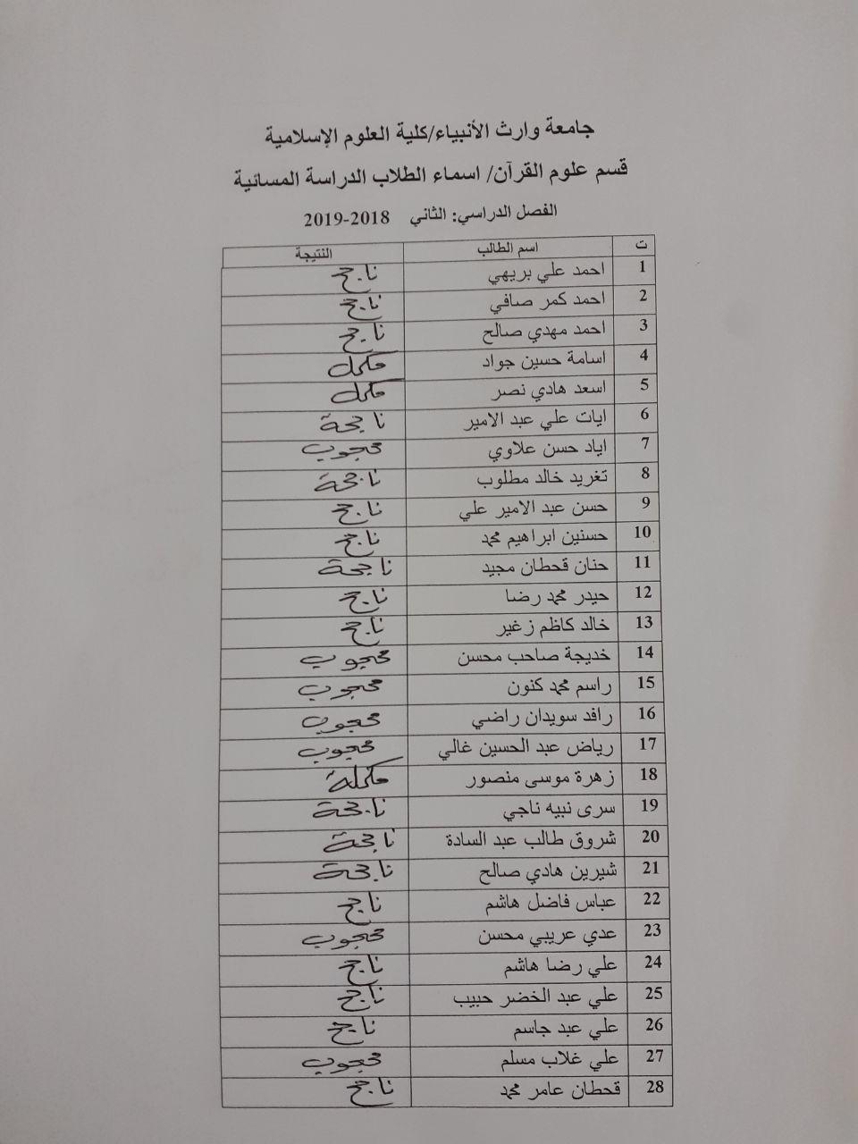 نتائج طلبة كلية العلوم الاسلامية / قسم علوم القرآن