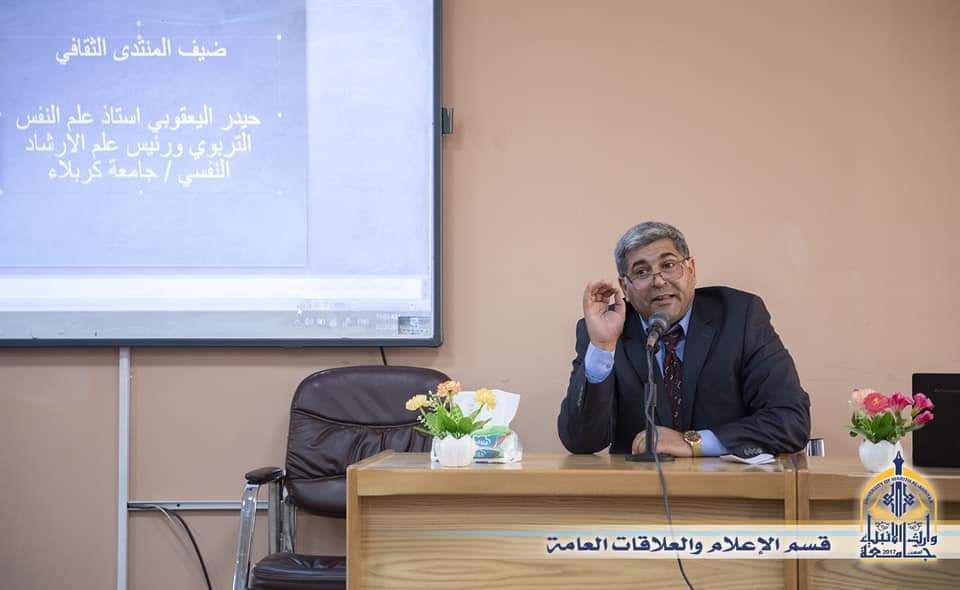 القى البروفيسور حيدر اليعقوبي استاذ علم النفس ورئيس قسم الارشاد النفسي في جامعة كربلاء محاضرة علمية عن ( كيفية التعبير عن الذات في مفهوم الانا ) في جامعة وارث الانبياء برعاية كلية العلوم الاسلامية ضمن برنامجها الاسبوعي الثقافي .
