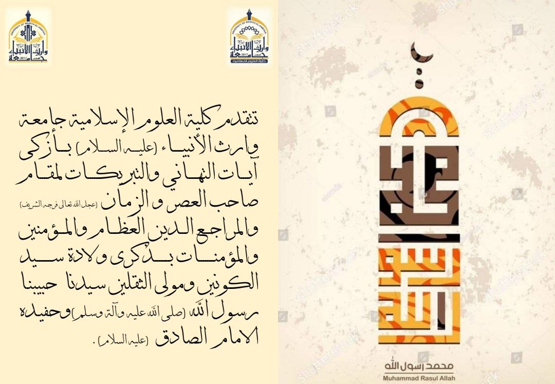 تتقدم كلية العلوم الإسلامية جامعة وارث الأنبياء (عليه السلام) بأزكى آيات التهاني والتبريكات لمقام صاحب العصر و الزمان (عجل الله تعالى فرجه الشريف) والمراجع الدين العظام والمؤمنين والمؤمنات بذكرى ولادة سيد الكونين ومولى الثقلين سيدنا حبيبنا رسول الله (صلى الله عليه وآلة وسلم )وحفيده الامام الصادق (عليه السلام).