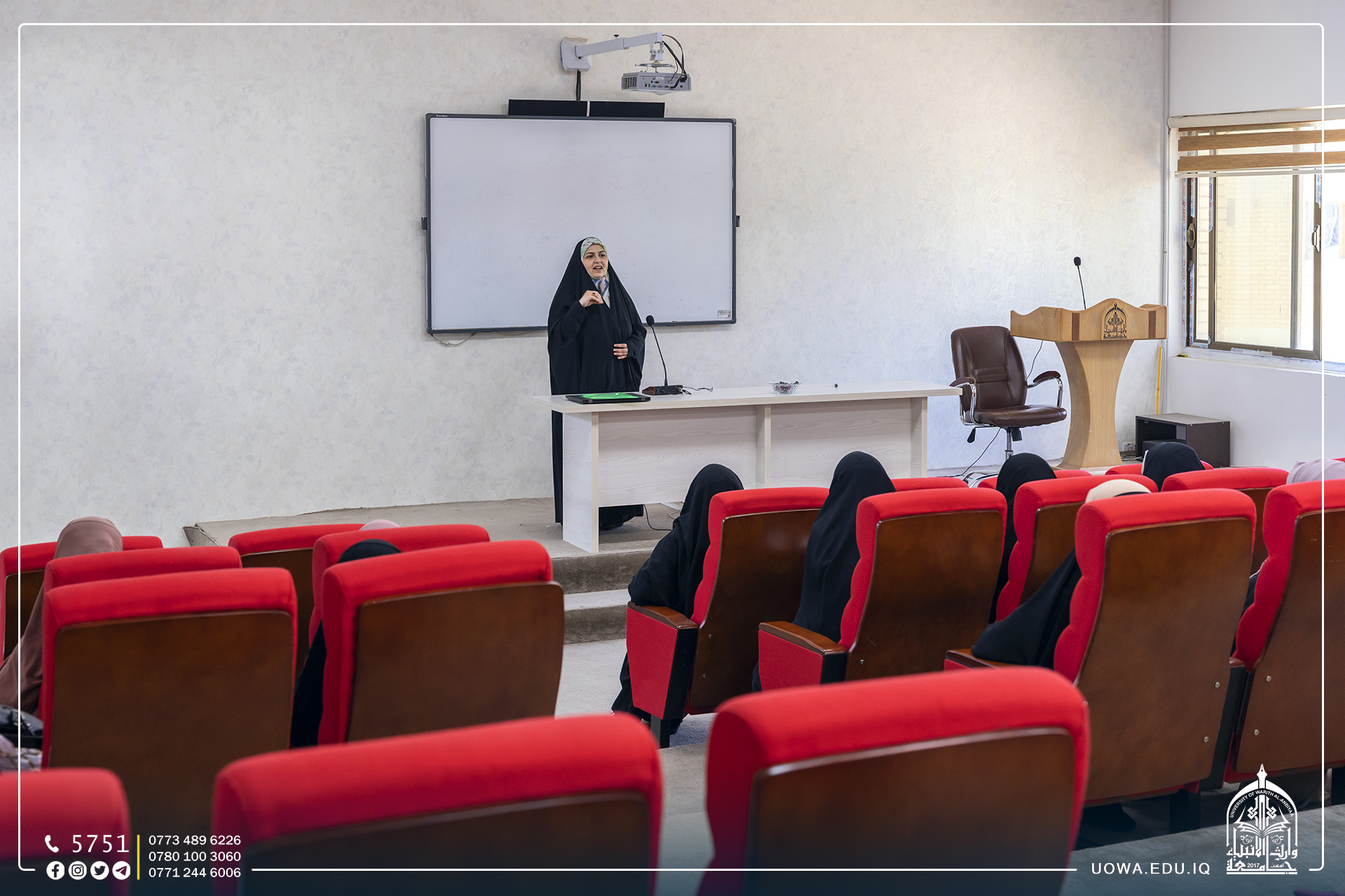 (لأنكِ حواء) محاضرة علمية اقامتها كلية القانون بالتعاون مع قسم تطوير الموارد البشرية في العتبة الحسينية المقدسة، قدمتها المدربة نور العامري تناولت الفروق التكوينية واثرها على حياة الانسان،واختلاف طريقة تفكير الرجل والمرأة بالإضافة الى لغة التعبير عن المشاعر و اهميتها في حياتهما.