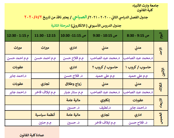 جدول المحاضرات الاسبوعية الالكتروني للدارسة الصباحية للفصل الدراسي الثاني