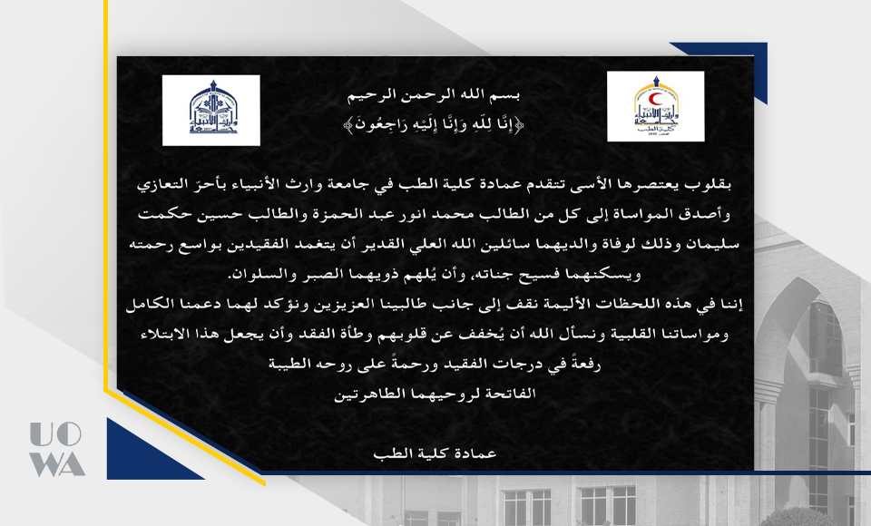 في خضم الأجواء الروحية السامية للزيارة الاربعينية الخالدة تتقدم عمادة كلية الطب جامعة وارث الأنبياء ع بأسمى عبارات التقدير والفخر والاحترام الى طلبتنا الاعزاء المشاركين في مفارز الخدمة الطبية المنتشرة على جميع طرق الزائرين لما بذلوه من جهد ووقت وخبرة في تطبيب ومعالجة وتخفيف الم الزائرين الكرام والذي لم يكن ليحصل لولا أن تتوفر لدى هؤلاء الثلة الطيبة من بناتنا وأبناءنا الرغبة والعلم والمهارة التي مكنتهم من أداء هذه المهمة العظيمة. أن التقيمات التي وردتنا من قبل الأطباء المشرفين على عمل طلبتنا المتطوعين كانت رائعة جدا ومحط اعتزاز وفخر لنا جميعاً ، حيث أشار جميع المشرفين إلى الانضباط العالي الذي اتصف به طلابنا الاعزاء اضافة إلى امتلاكهم الامكانية العلمية والمهارة السريرية التي تؤهلهم للعمل في كل الأوقات وتحت أقسى الظروف وهذا بلا شك يعكس جهد اساتذة الكلية في تدريب وتطوير المهارات النظرية والعملية والسريرية لطلبتنا الاعزاء وهذا ما كان ليتحقق لولا الدعم المتواصل والاشراف المستمر من قبل السيد رئيس الجامعة المحترم.