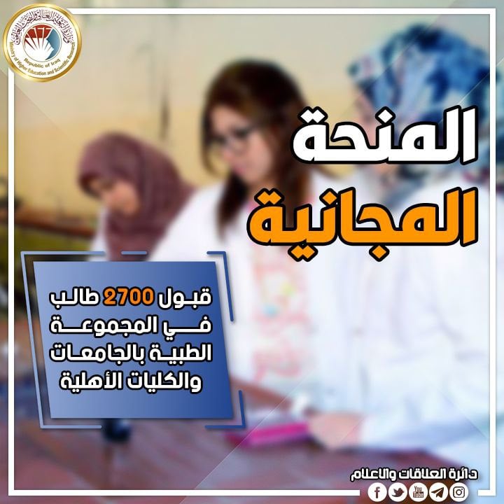 تعلن وزارة التعليم العالي والبحث العلمي قبول ألفين وسبعمئة طالب ضمن المنحة المجانية الخاص بالمجموعة الطبية (طب، طب أسنان، الصيدلة) في الجامعات والكليات الأهلية للعام الدراسي 2022/2021.وأظهرت بوابة دائرة التعليم الجامعي الأهلي (www.pe-gate.org) قبول (٢٧٠٠) طالب جرى تدقيق ملفاتهم في الجامعات والكليات الأهلية وتوزعوا على سبع وأربعين جامعة وكلية.وفي الوقت الذي يمكن للطلبة المتقدمين الاطلاع على نتائج تقديمهم عبر حسابهم الطلابي فإن المقبولين منهم يتوجب عليهم التوجه الى الجامعات والكليات الأهلية مستصحبين معهم رمز التسجيل (CODE) مع وثائقهم الرسمية لإتمام عملية التسجيل والمباشرة غدا الخميس الموافق 2021/12/30