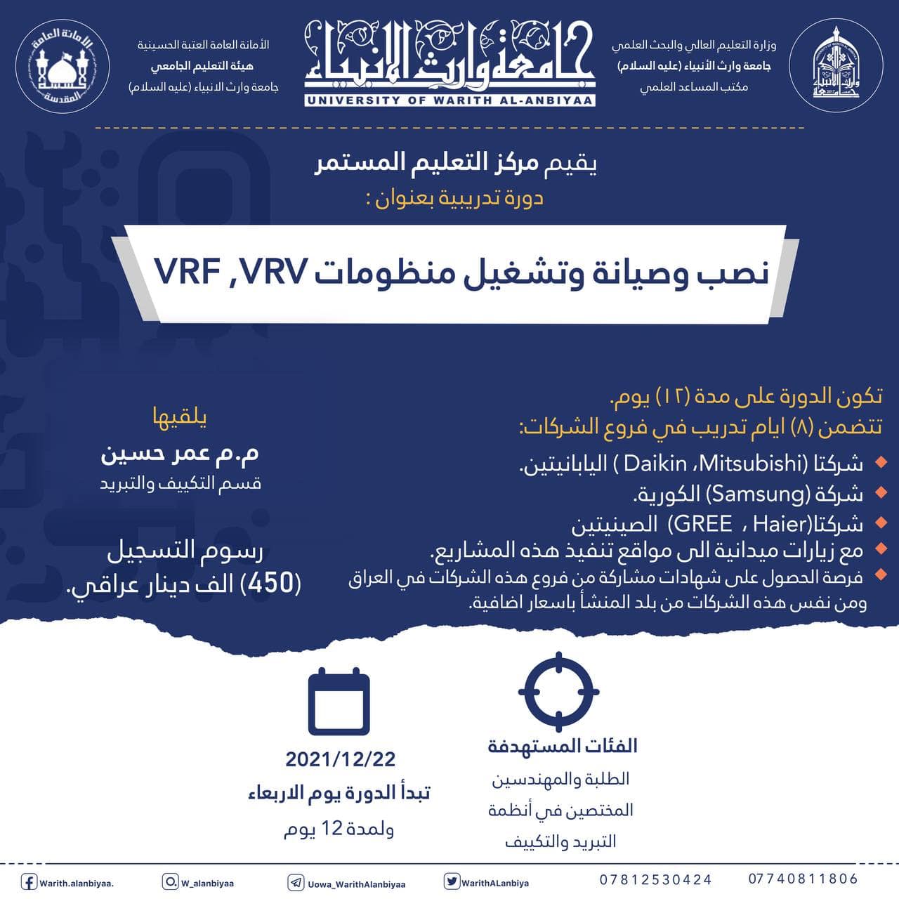 * مع زيارات ميدانية الى مواقع تنفيذ هذه المشاريع.* فرصة الحصول على شهادات مشاركة من فروع هذه الشركات في العراق ومن نفس هذه الشركات من بلد المنشأ باسعار اضافية.* على الراغبين بالتسجيل في الدورة والتي ستبدأ يوم الاربعاء الموافق 22/12/2021 التسجيل من خلال الرابط ( https://bit.ly/3DPnG13 ) او مراجعة مركز التعليم المستمر في الجامعة.* علما ان رسوم التسجيل في الدورة هي (450) الف دينار عراقي.