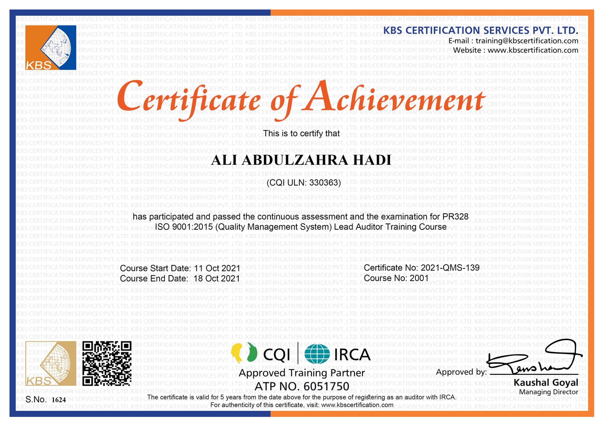 ضمن سعيها للارتقاع بمستوى جودة الخدمات المقدمة لطلبتها الأعزاء حصل رئيس قسم ضمان الجودة والاداء الجامعي المدرس المساعد علي عبد الزهرة هادي على الاعتماد الدولي بادارة الجودة بدرجة رئيس مدققيين بعد اجتياز التدريب والاختبار في المعهد العالي للجودة في بريطانيا CQI | IRCA 9001:2015 Lead Auditor
