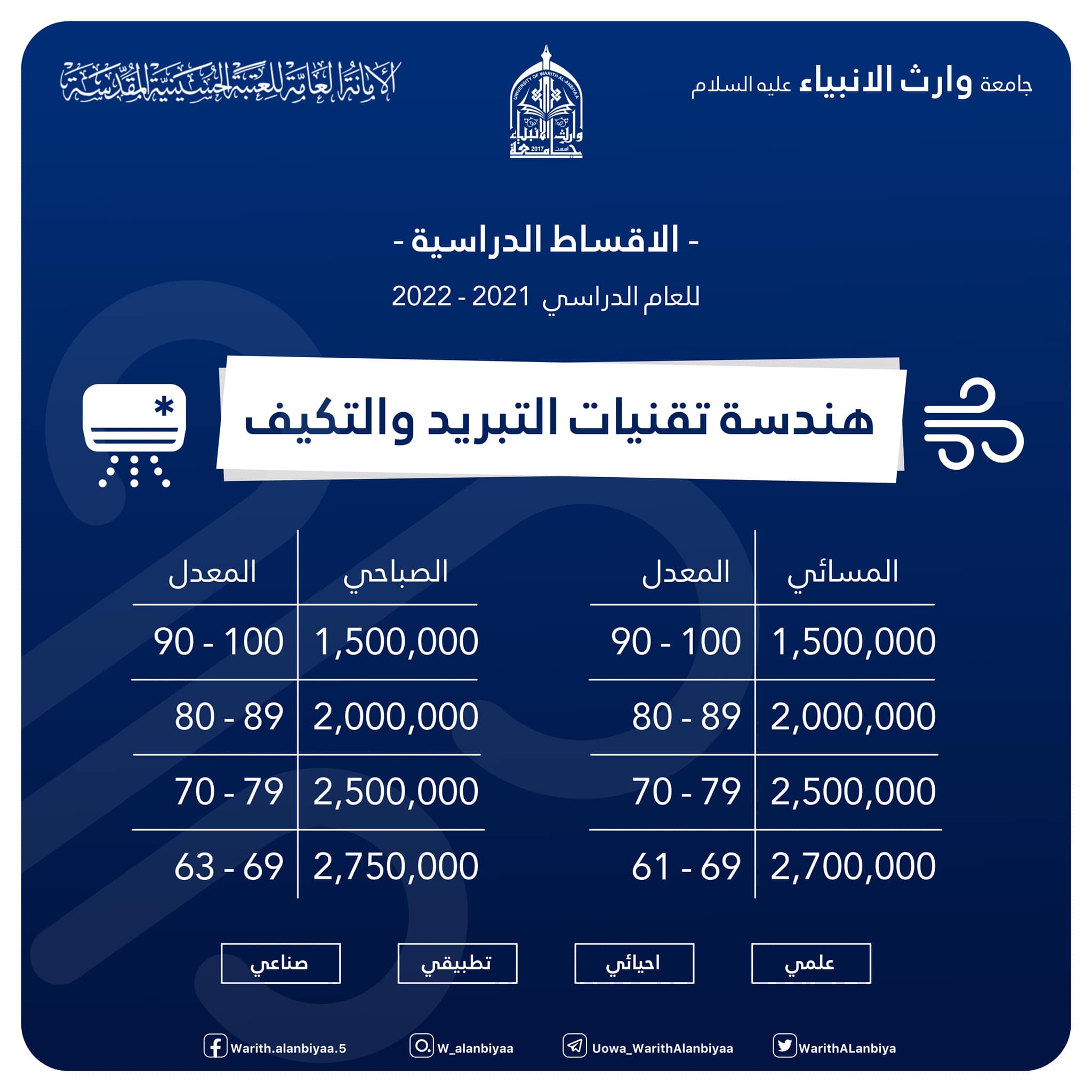 *قسم هندسة الطب الحياتي*فرع الدراسة الإعدادية -احيائي- تطبيقي-علمي نوع الدراسة-صباحي فقطالأقساط الدراسية -حسب المعدلالتدريب الصيفي مركز الوارث ديرمان للاطرف الصناعية -مستشفى الامام زين العابدين(عليه السلام)*قسم الهندسة المدنية*فرع الدراسة الإعدادية - تطبيقي-علمي نوع الدراسة-صباحي-مسائي الأقساط الدراسية -حسب المعدل*قسم هندسة تقنيات التكييف والتبريد*فرع الدراسة الإعدادية-تطبيقي-علمي-احيائي