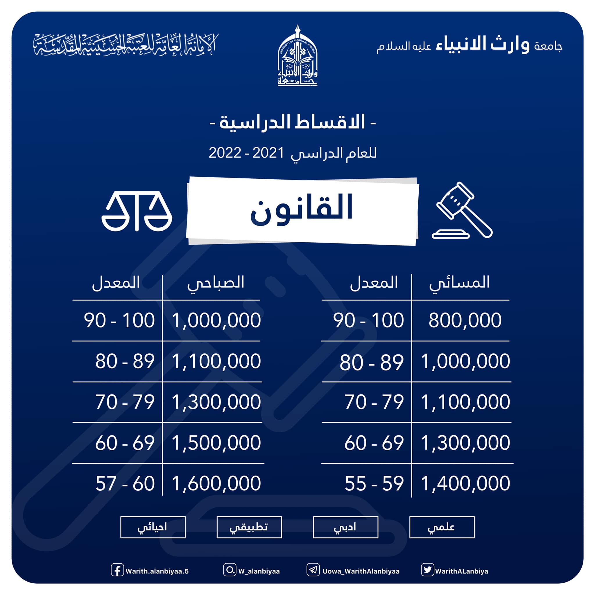 اليكم المعلومات التالية :-التعيين للطلبة الاوائل في مؤسسات العتبة الحسينية المقدسة *كلية القانون*فرع الدراسة الإعدادية - تطبيقي-علمي -احيائينوع الدراسة-صباحي _مسائي الأقساط الدراسية -حسب المعدل