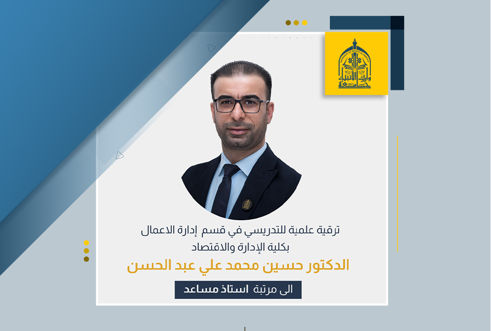 حصل الدكتور حسين محمد كشكول، التدريسي في قسم إدارة الأعمال بكلية الإدارة والاقتصاد بجامعة وارث الأنبياء (عليه السلام)، على ترقية علمية إلى مرتبة أستاذ مساعد.