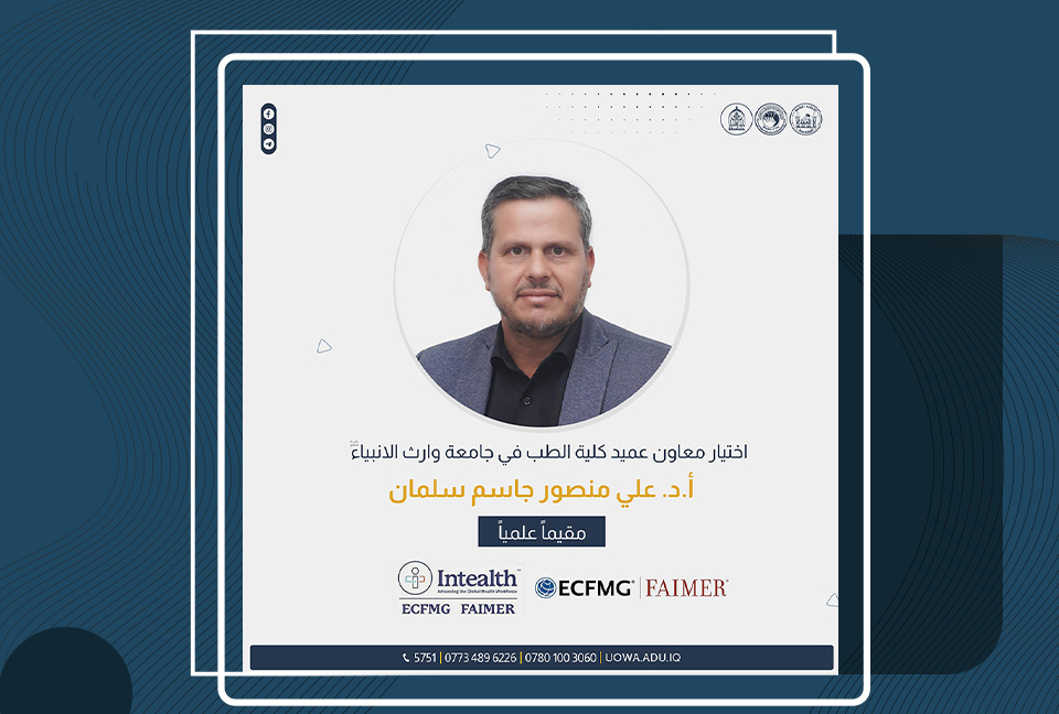تم اختيار الدكتور علي منصور جاسم، معاون عميد كلية الطب في جامعة وارث الأنبياء (عليه السلام)، كمقيم علمي للمتقدمين على زمالة FAIMER، IFI Fellowship for Medical Education، للعام 2024.
