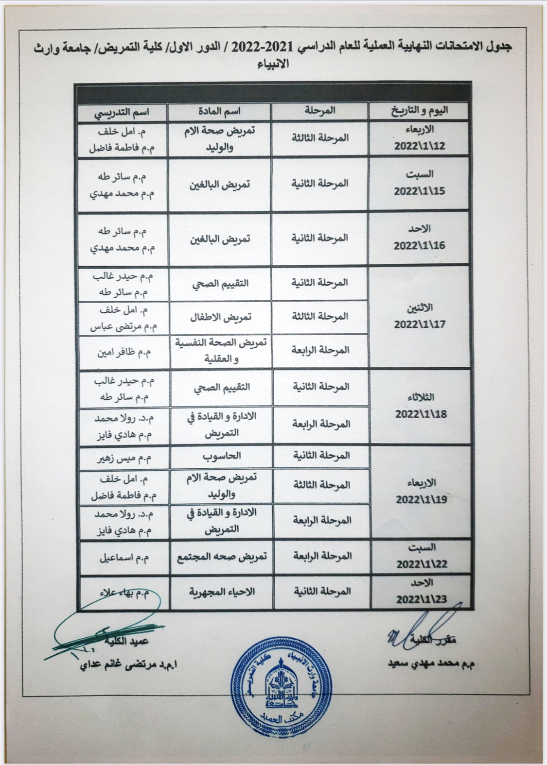 طلبتنا الاعزاء... الجدول الامتحاني الخاص بالامتحانات النهائية في كلية التمريض للعام الدراسي 2021-2022