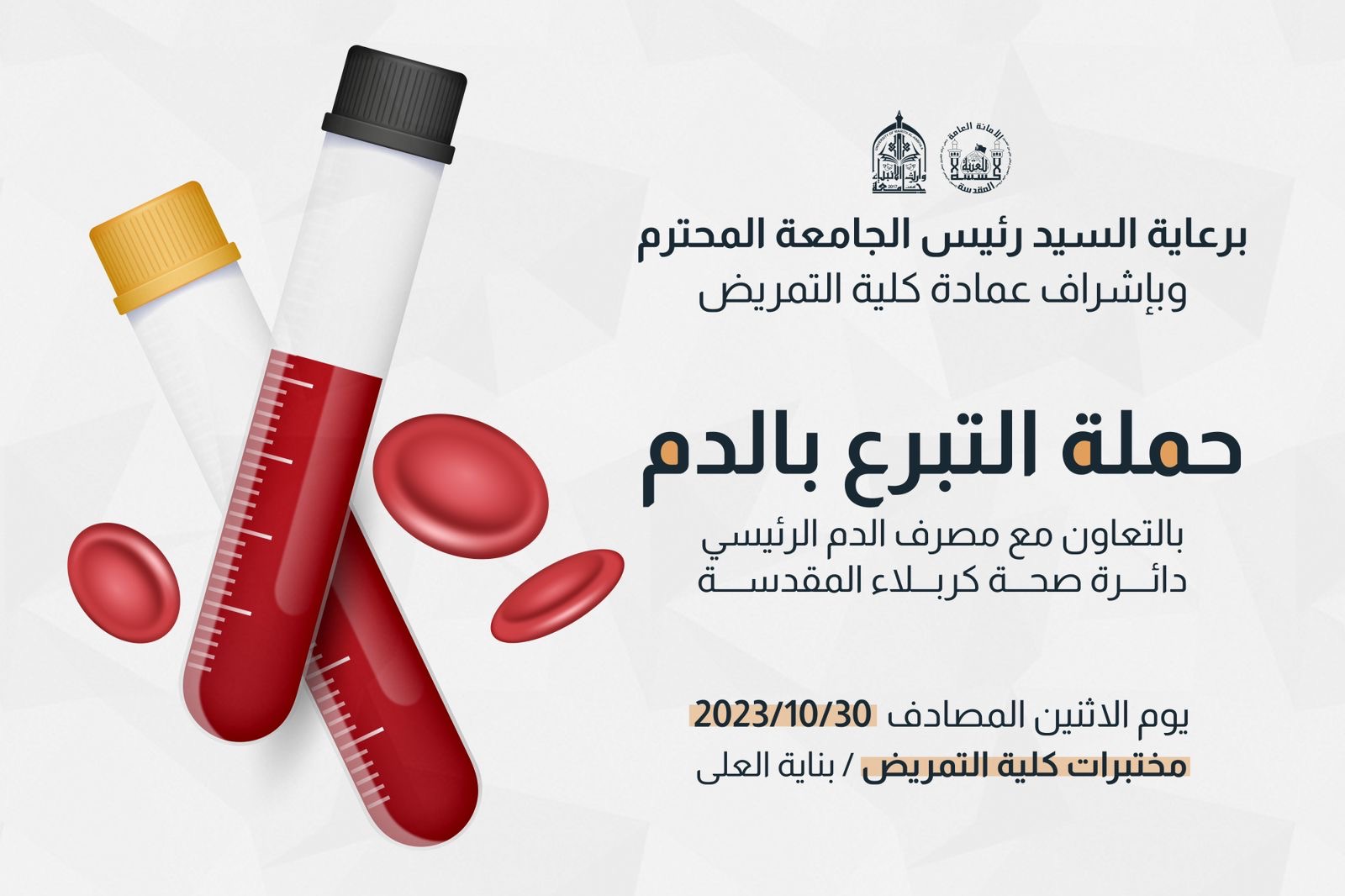 برعاية السيد رئيس الجامعة المحترم وباشراف عمادة كلية التمريض تنظم كلية التمريض جامعة وارث الانبياء (ع) حملة التبرع بالدم بالتعاون مع دائرة صحة كربلاء المقدسة مصرف الدم الرئسي يوم الاثنين بتاريخ 30/10/2023 في مختبرات كلية التمريض بناية العلى ندعوكم للمشاركة بحملة التبرع تحت شعار قطره من دمك .... تنقذ حياة غيرك