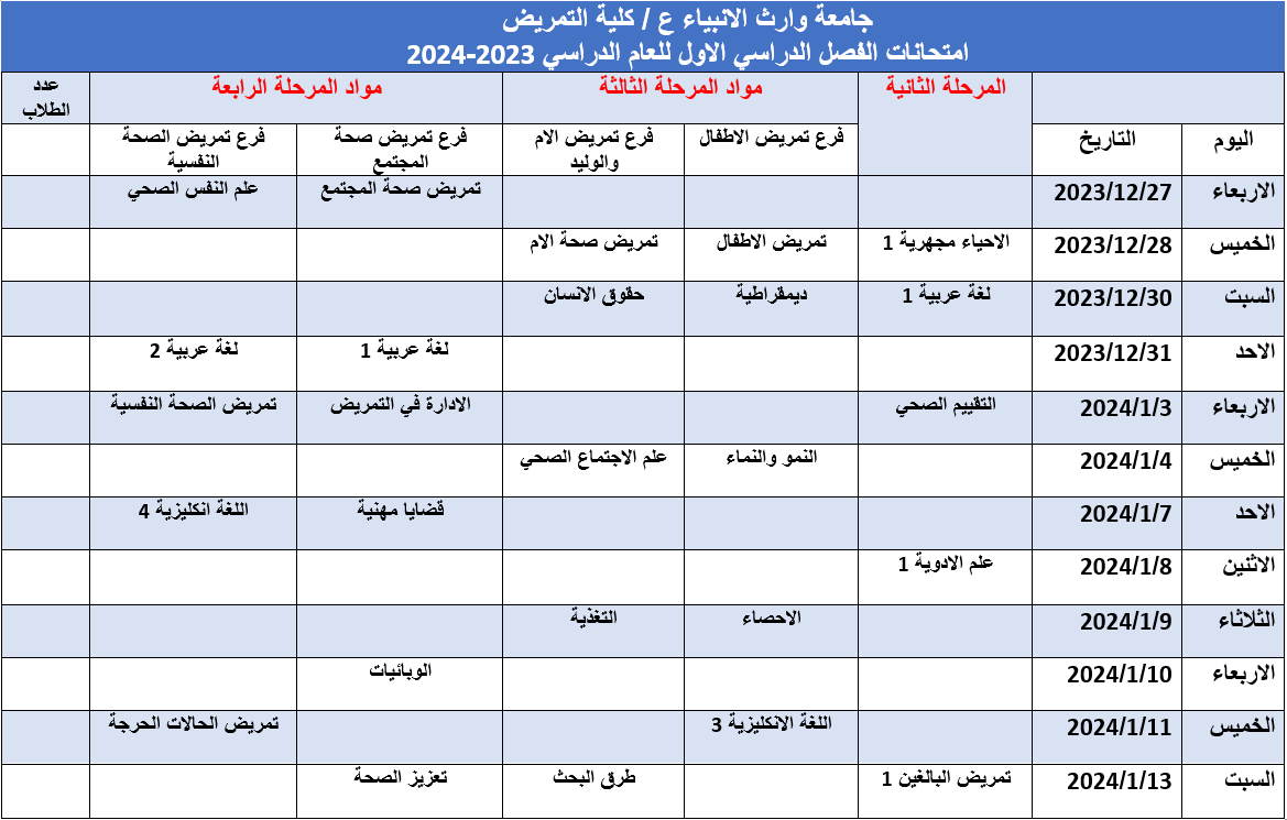 طلبتنا الاعزاء .. نرفق لكم جدول الامتحانات النهائية للفصل الاول من العام الدراسي 2023-2024 و للمراحل الثانية و الثالثة و الرابعة مع التعليمات الامتحانية متمنين لكم دوام التوفيق و النجاح.