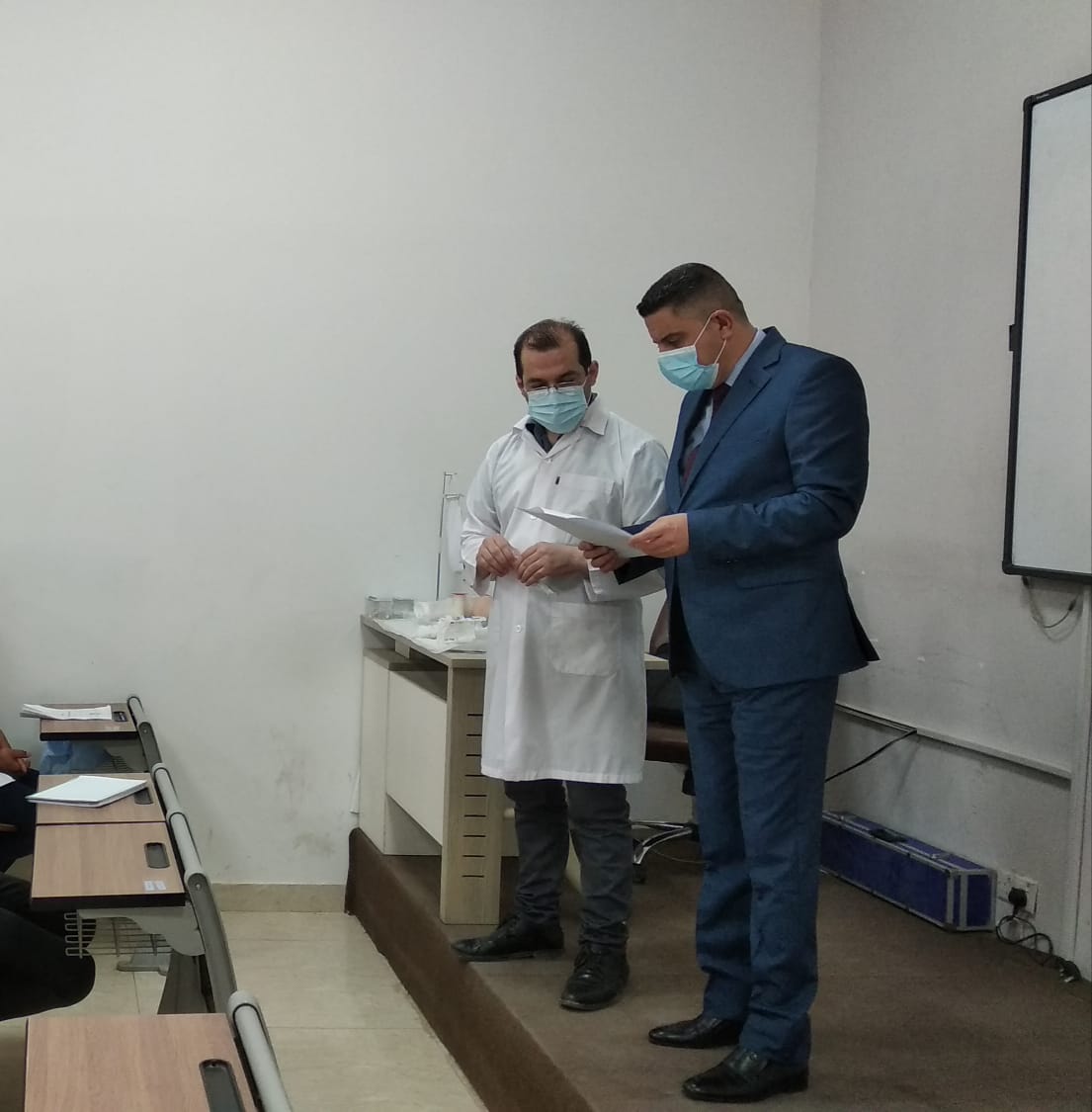 تفقد السيد عميد كلية التمريض المحترم ( أ.م.د. مرتضى غانم عداي ) سير العملية التعليمية للفصل الدراسي الثاني داخل المختبرات العلمية حيث اكد جنابه على ضروره الالتزام بالارشادات والتعليمات الوقائية الصحية اللازمة.من جانب اخر يواصل تدريسيو الكلية تدريب الطلبة للمواد العملية الاساسية والذي جاء حسب توجيهات الوزارة بضرورة اعتبار التعليم المدمج كوسيلة لإيصال المنهج العلمي في الوضع الراهن لطلبتنا الاعزاء.